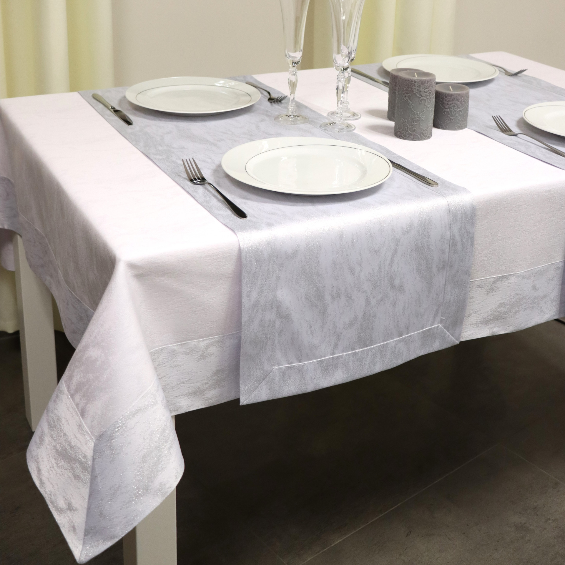 Bieżnik nowoczesny Srebrna Chmurka – nadaje wyjątkowego charakteru w Twoim domu. Wykonany jest z żakardowej tkaniny z dodatkiem nitki metalizowanej w kolorze srebrnym, oraz jest wykończony elegancką listwą o szerokości 5 cm. Nadaje bardzo oryginalny wygląd, który doskonale pasuje do większości salonów, ale także znajdzie zastosowanie w restauracjach i hotelach. Komponuje się z kontrastującymi dodatkami, takimi jak zastawa stołowa, sztućce czy świeczniki. Jest łatwy w utrzymaniu, kolory nie tracą swojej barwy, a więc obrus zachowuje swoje walory przed długi czas użytkowania.