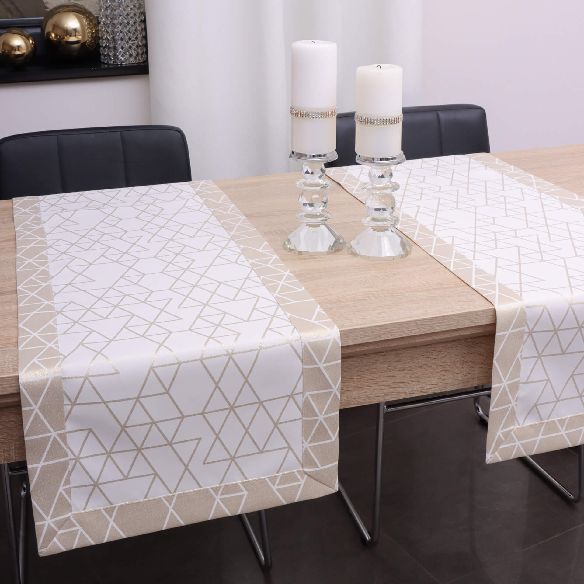 Bieżnik nowoczesny plamoodporny TOKYO – nadaje wyjątkowego charakteru w Twoim domu. Wykonany jest z żakardowej tkaniny z dodatkiem nitki metalizowanej w kolorze złotym oraz jest wykończony elegancką listwą o szerokości 5 cm. Doskonale prezentuje się po jednej, jak i po drugiej stronie. Nadaje bardzo oryginalny wygląd, który doskonale pasuje do większości salonów, ale także znajdzie zastosowanie w restauracjach i hotelach. Komponuje się z kontrastującymi dodatkami, takimi jak zastawa stołowa, sztućce czy świeczniki. Jest łatwy w utrzymaniu, kolory nie tracą swojej barwy, a więc obrus zachowuje swoje walory przed długi czas użytkowania.