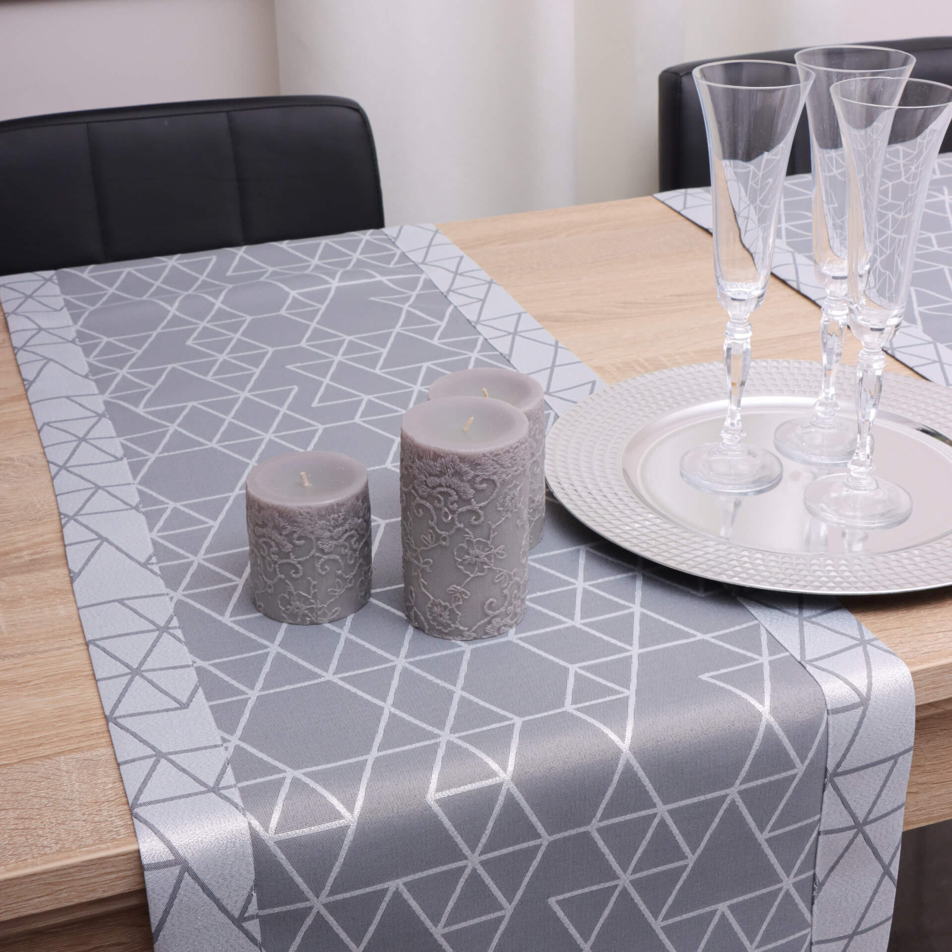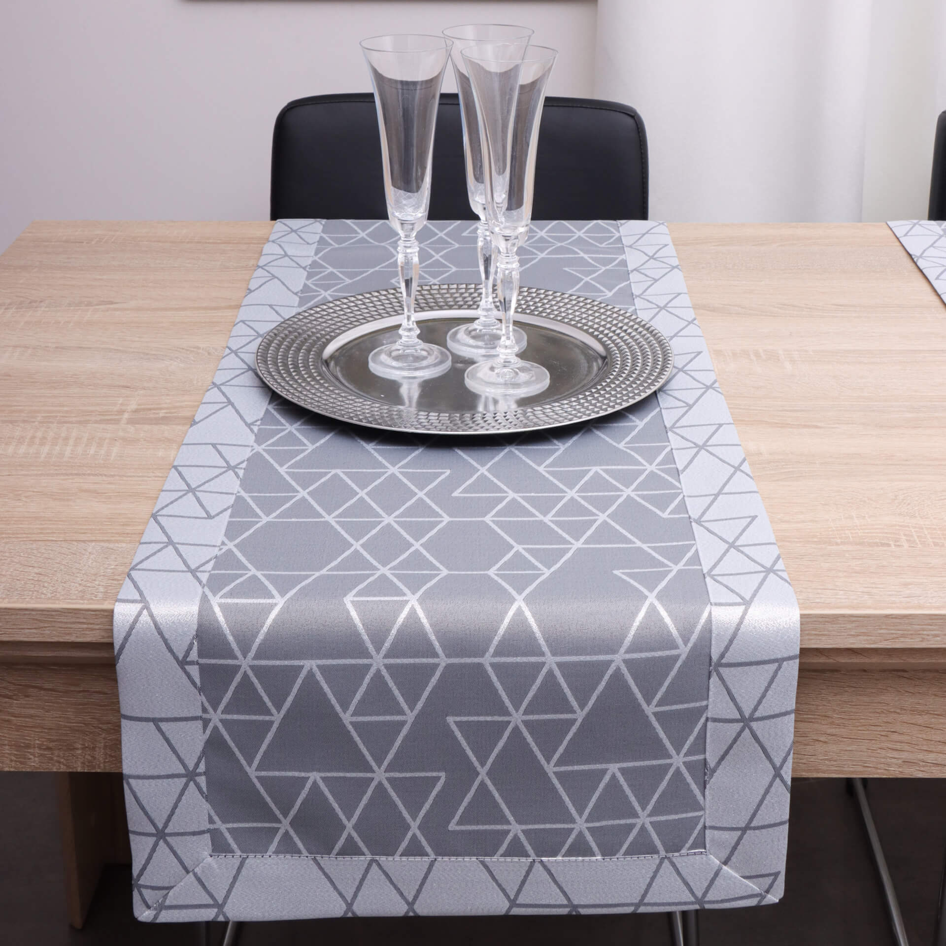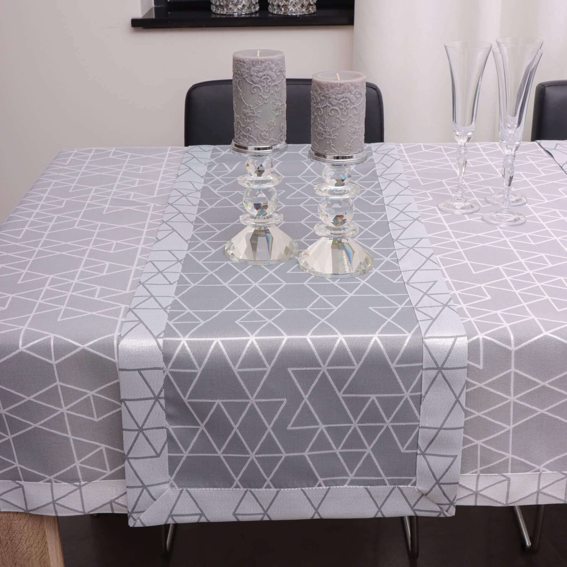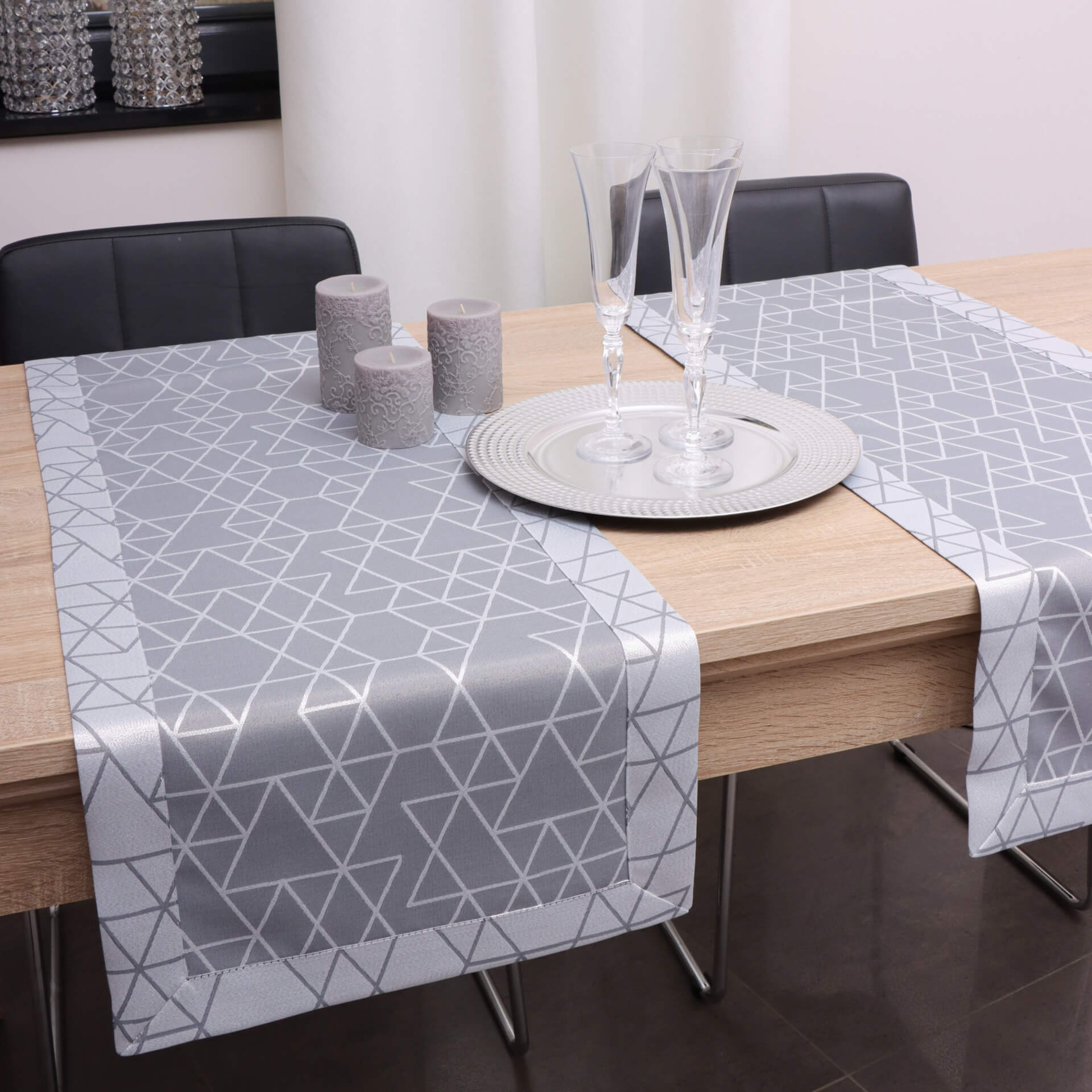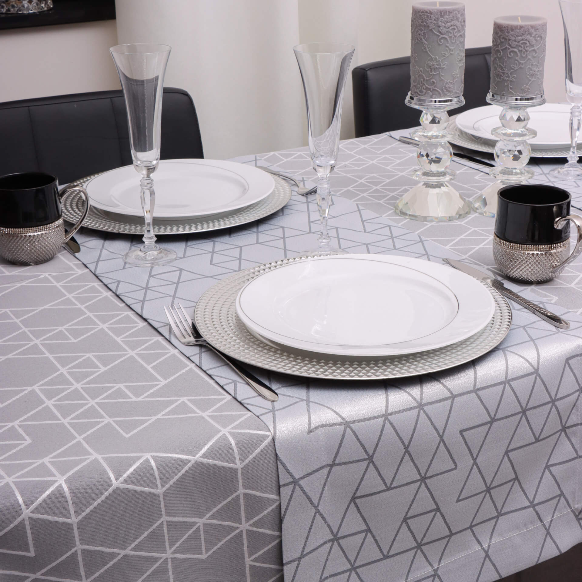 Bieżnik nowoczesny plamoodporny TOKYO – nadaje wyjątkowego charakteru w Twoim domu. Wykonany jest z żakardowej tkaniny z dodatkiem nitki metalizowanej w kolorze srebrnym oraz jest wykończony elegancką listwą o szerokości 5 cm. Doskonale prezentuje się po jednej, jak i po drugiej stronie. Nadaje bardzo oryginalny wygląd, który doskonale pasuje do większości salonów, ale także znajdzie zastosowanie w restauracjach i hotelach. Komponuje się z kontrastującymi dodatkami, takimi jak zastawa stołowa, sztućce czy świeczniki. Jest łatwy w utrzymaniu, kolory nie tracą swojej barwy, a więc obrus zachowuje swoje walory przed długi czas użytkowania.