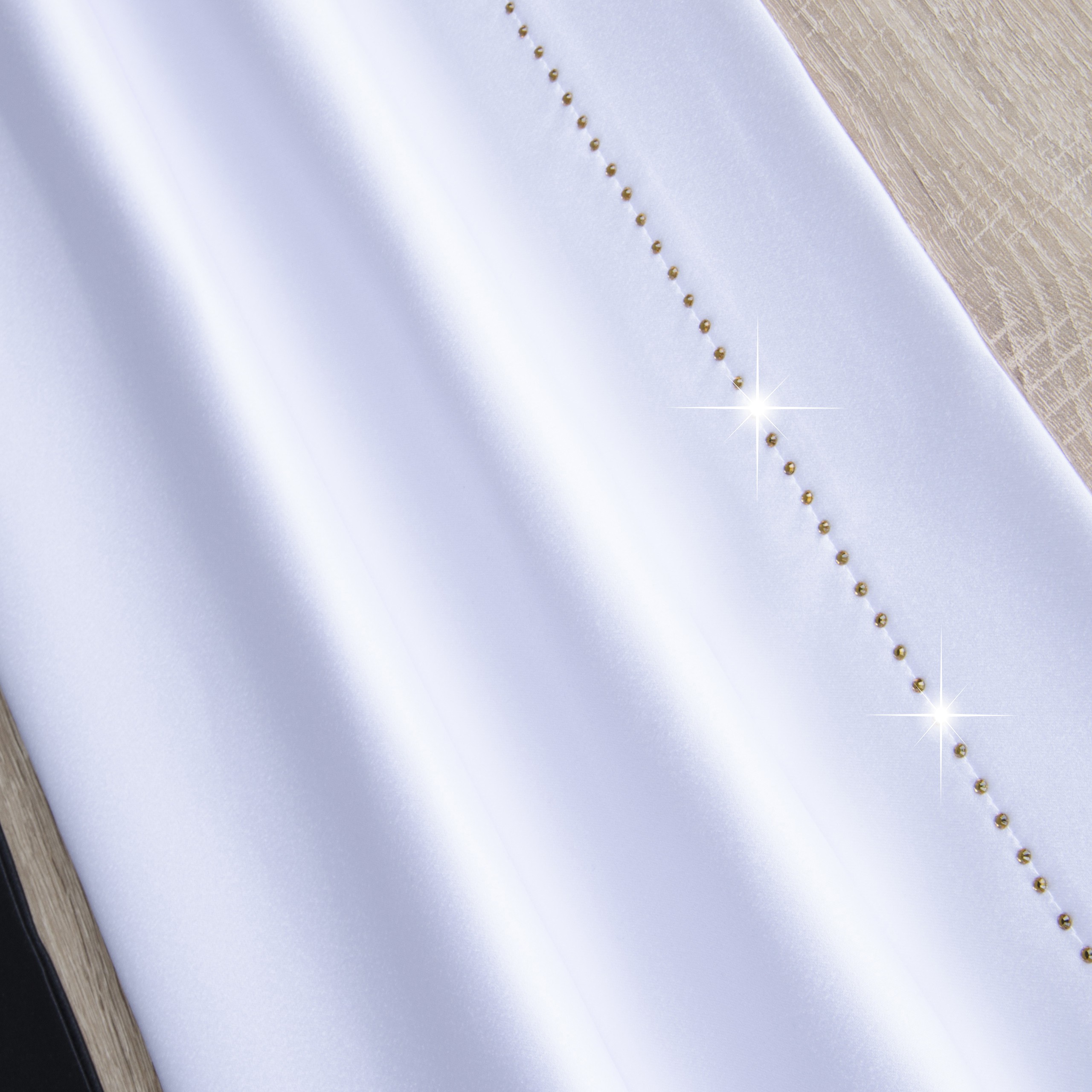 GLAMOUR to wyjątkowa kolekcja atłasowych serwet wykończonych ozdobną listwą o szerokości 7 cm, wzdłuż obszycia ozdobione są nowoczesnym wzorem wykonanym z metalowych, srebrnych dżetów.