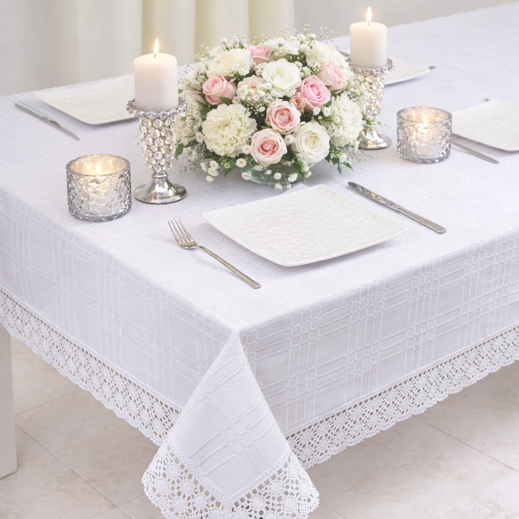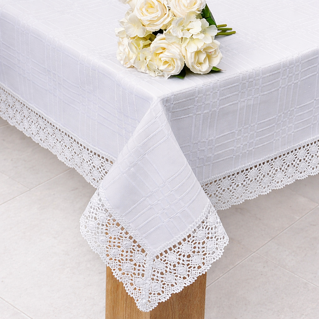 Obrus Bawełniany z koronką to wyjątkowa kolekcja matowych obrusów wykończonych ozdobną koronką bawełnianą o szerokości 7 cm. Dekoracyjna koronka nadaje obrusowi eleganckiego szyku oraz wyjątkowego wyglądu .
