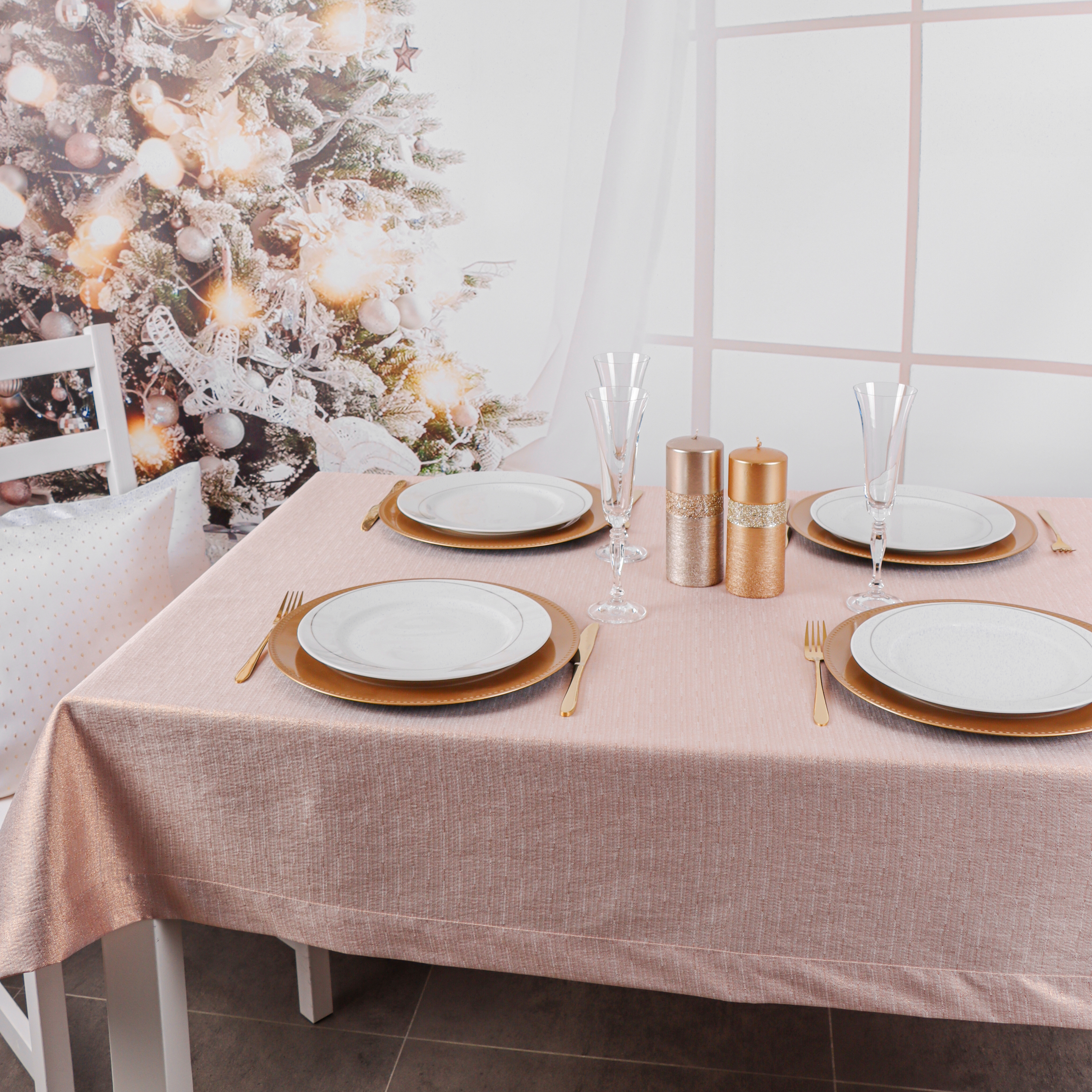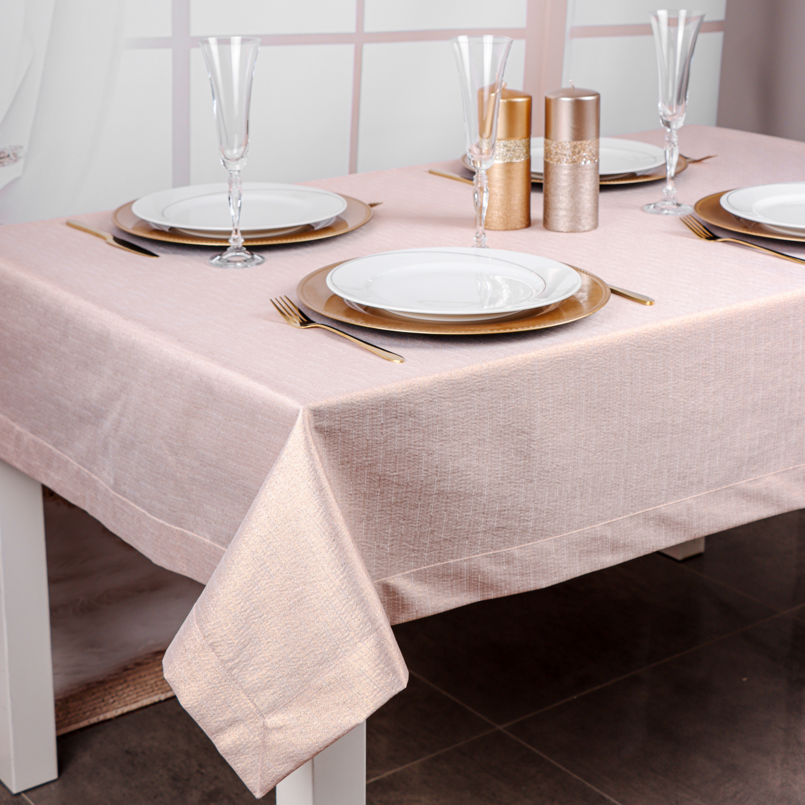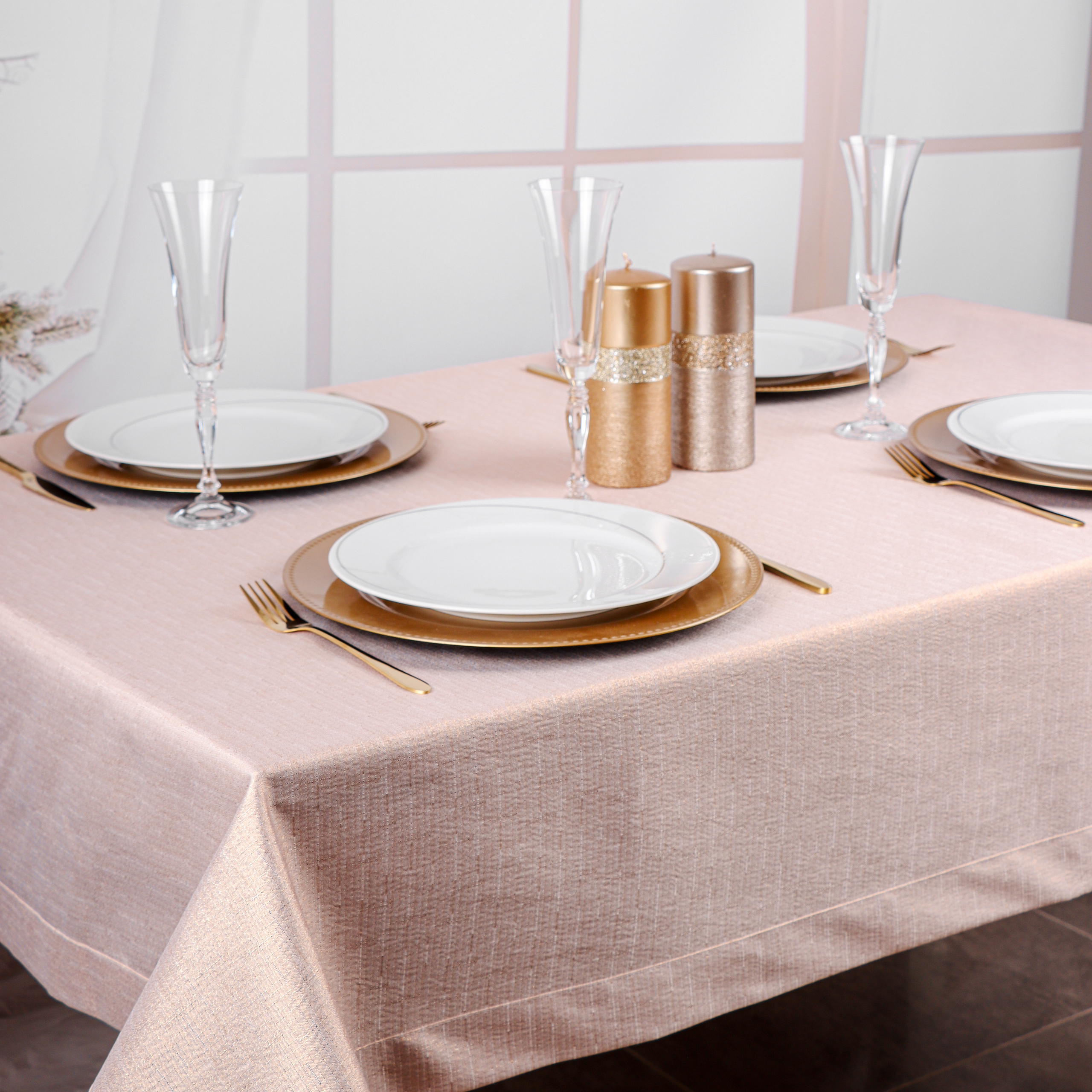 Brokat – to wyjątkowa kolekcja błyszczących obrusów wykończonych ozdobną 5cm listwą w kolorze złotym.