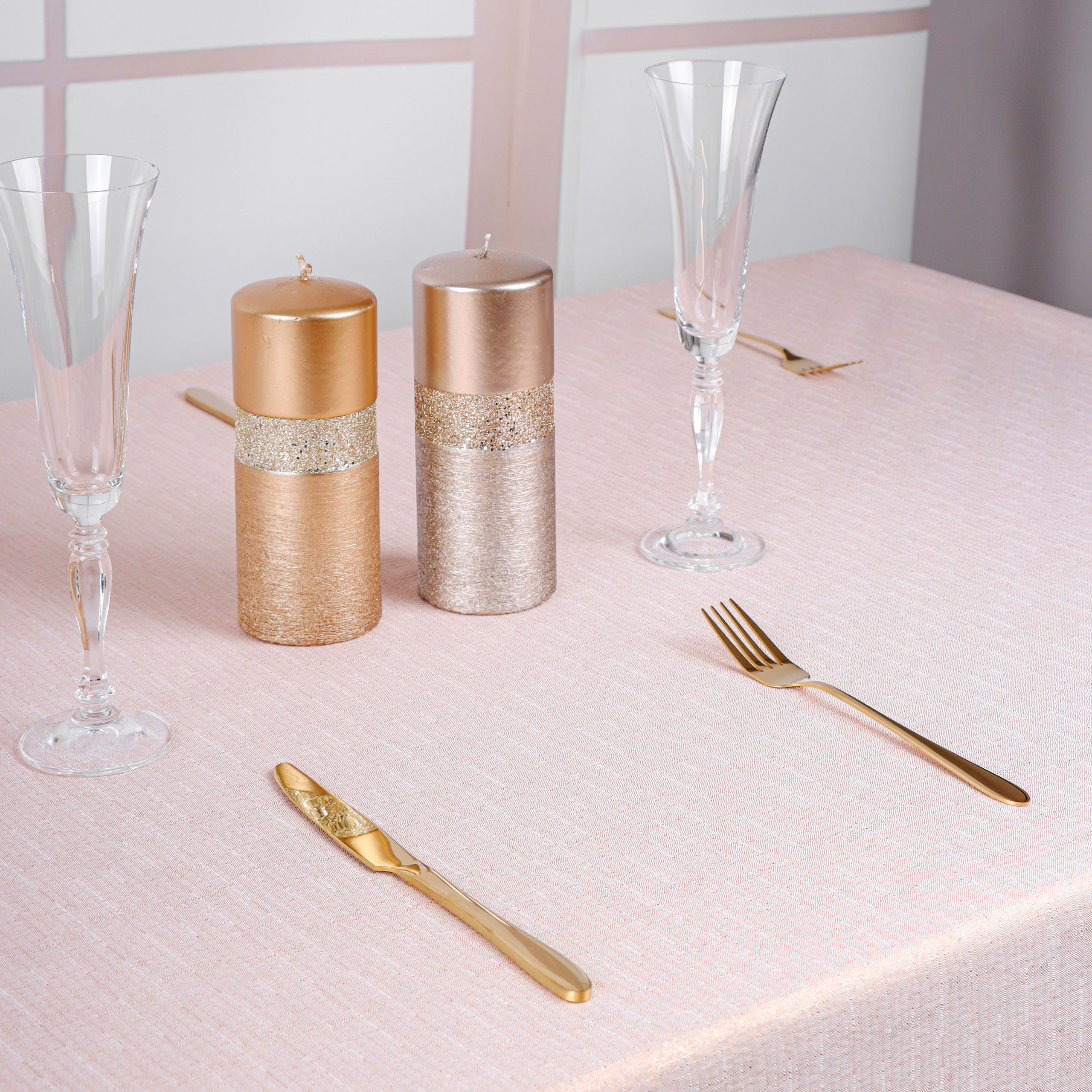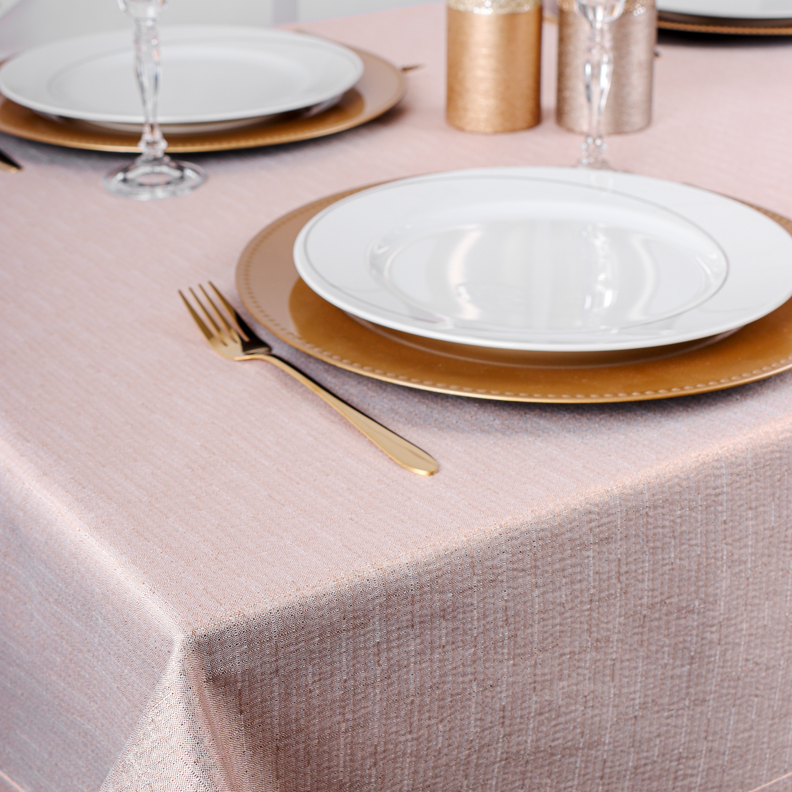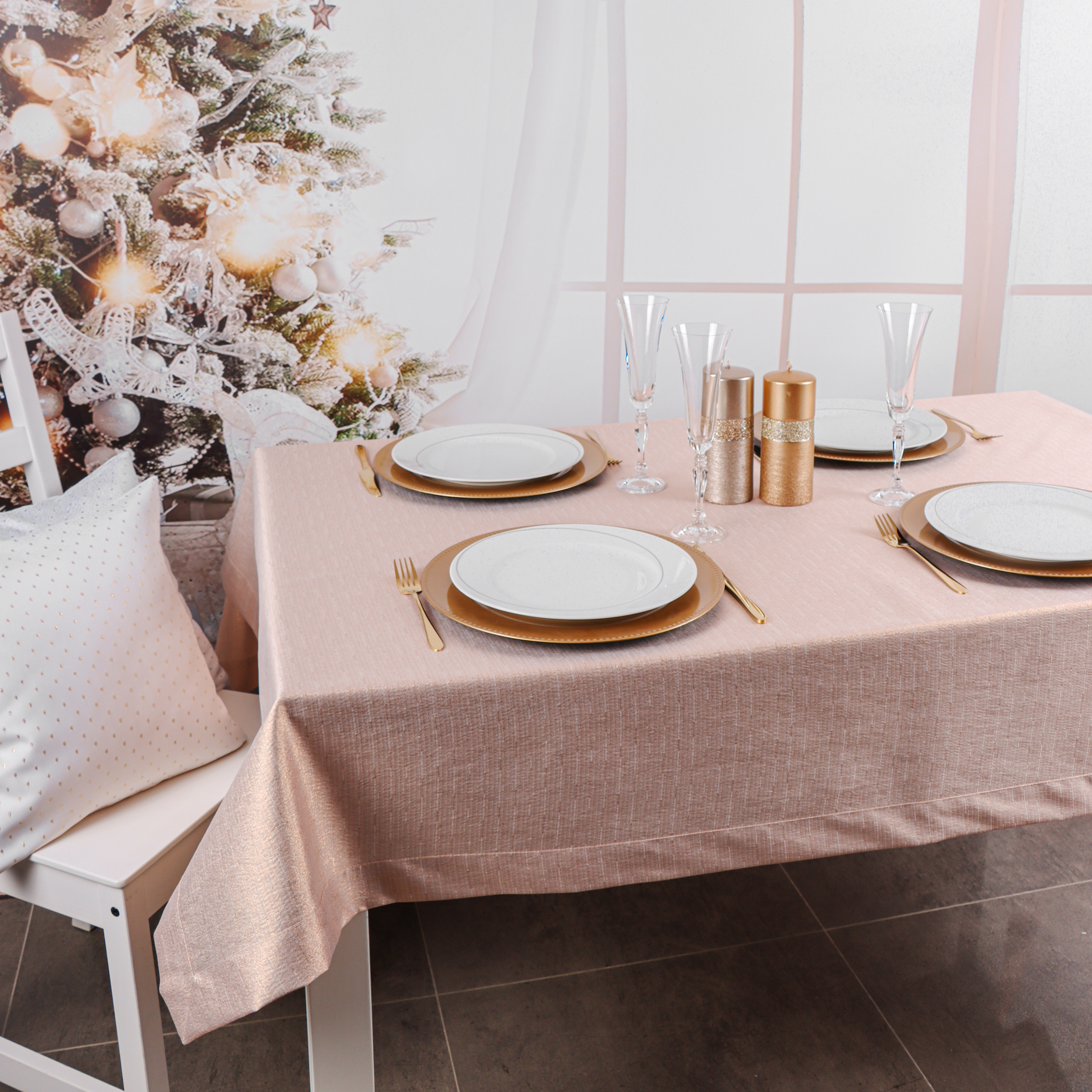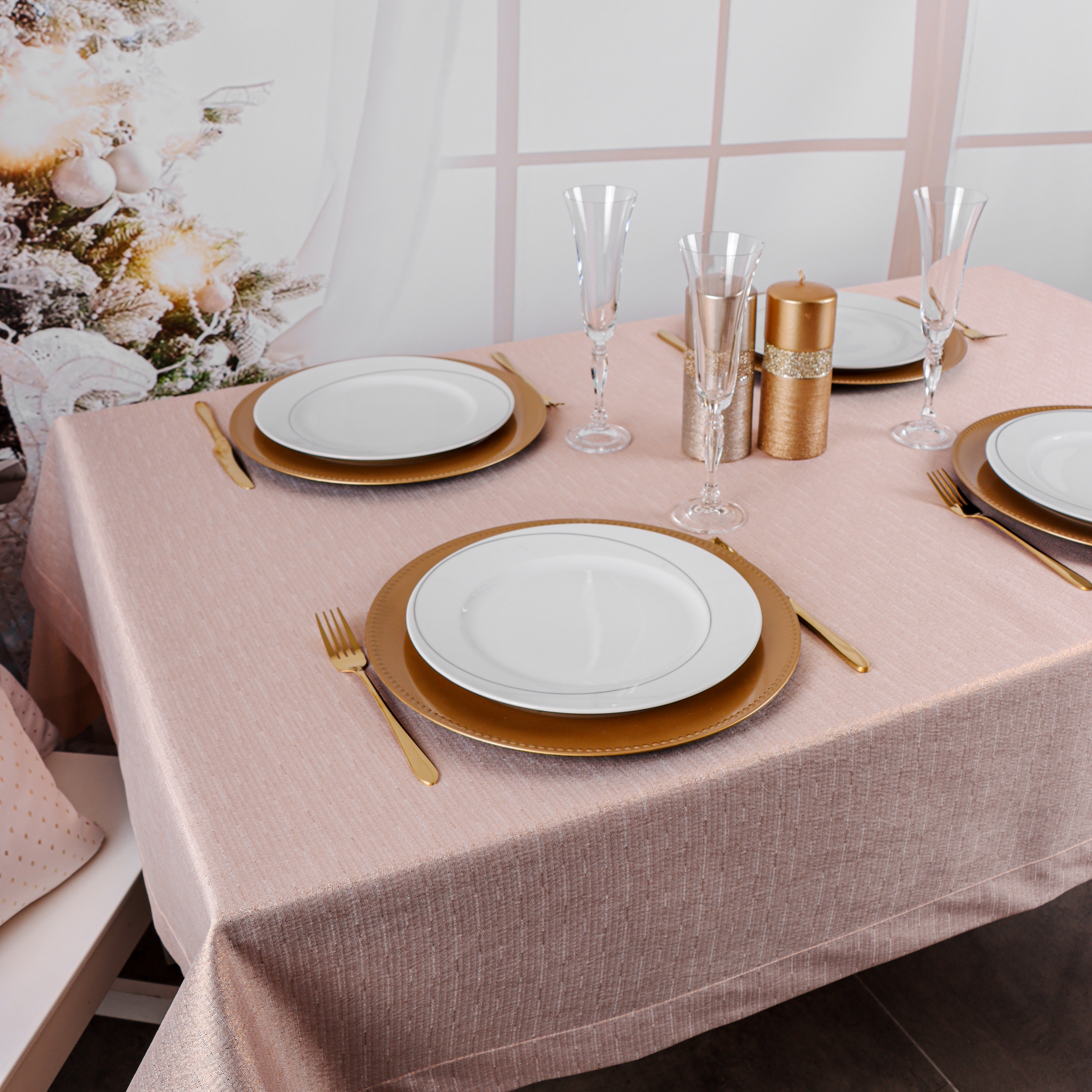 Brokat – to wyjątkowa kolekcja błyszczących obrusów wykończonych ozdobną 5cm listwą w kolorze złotym.