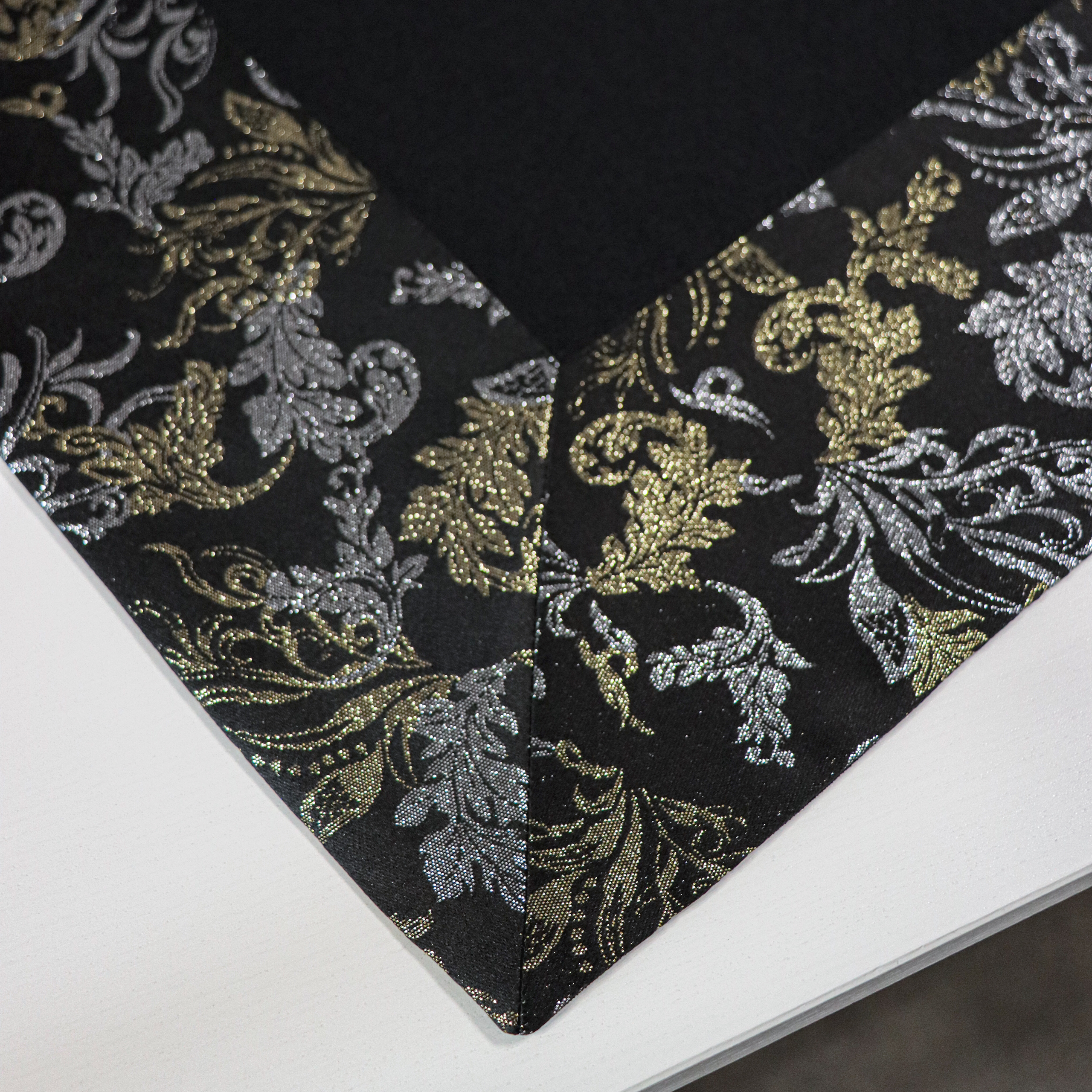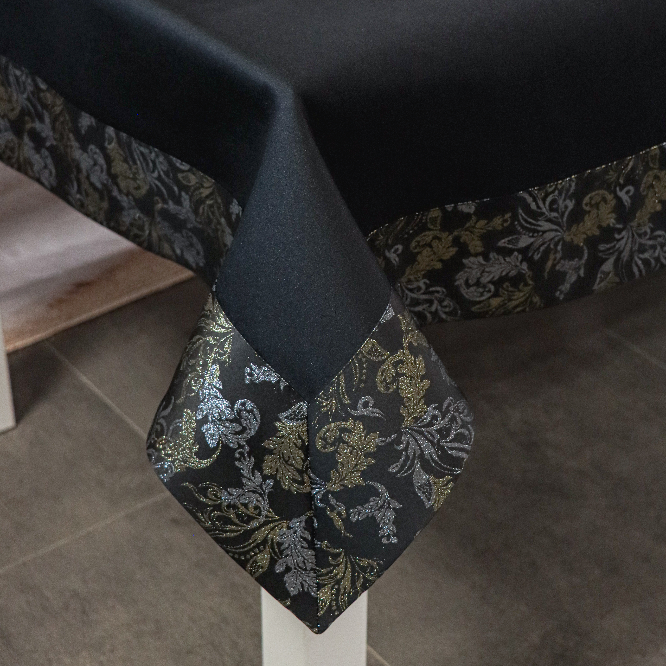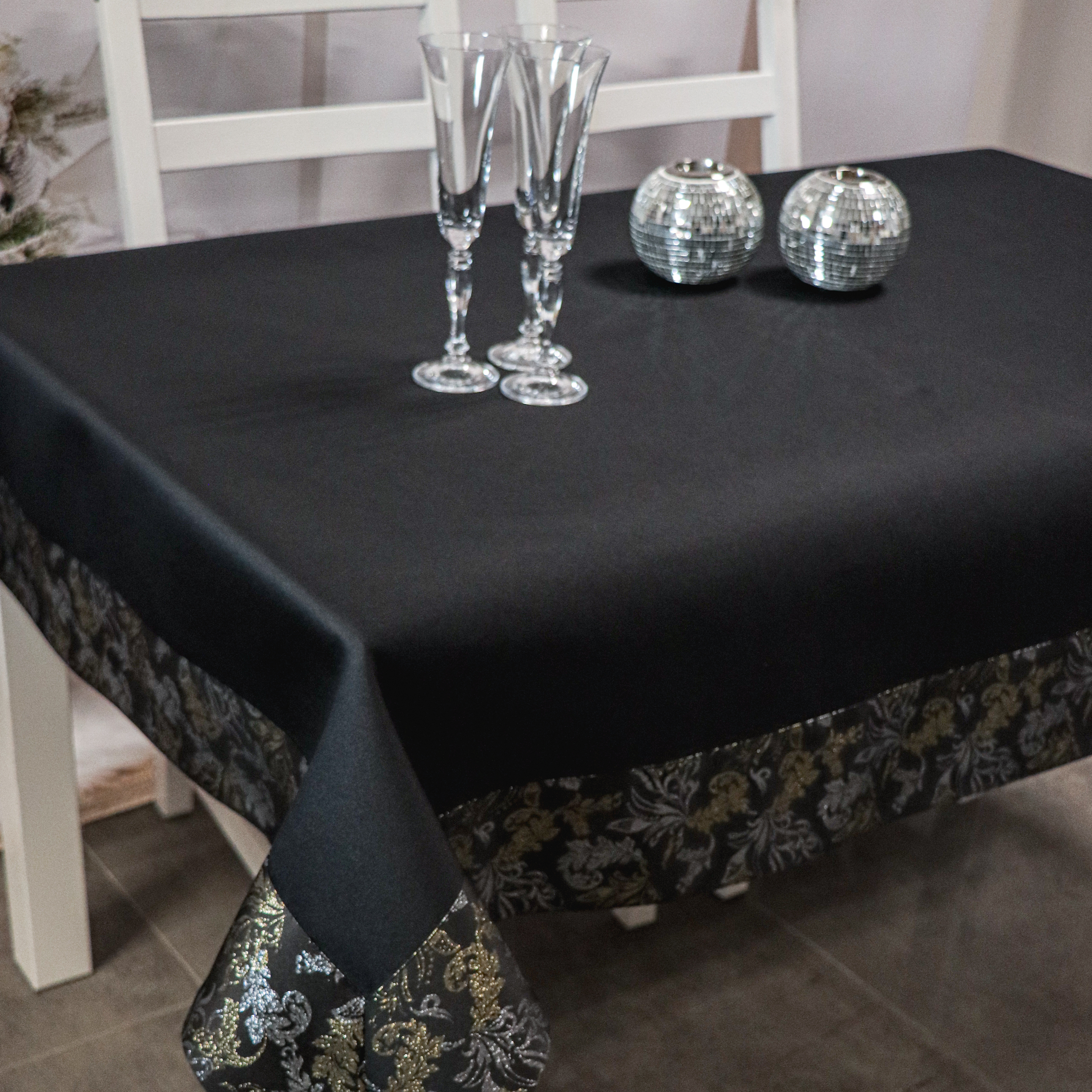 Obrusy wykonane są z wysokogatunkowej, plamoodpornej tkaniny poliestrowej, obszyte wokół ozdobną listwą o szerokości 10 cm, tkaną metalizowaną nitką w kolorze złotym, srebrnym i kolorze miedzi.