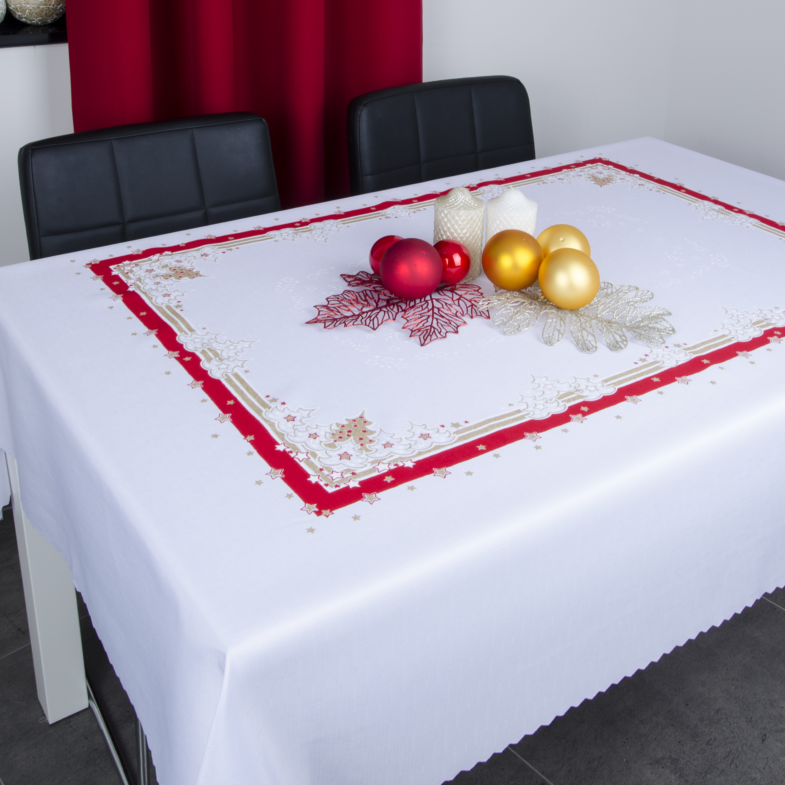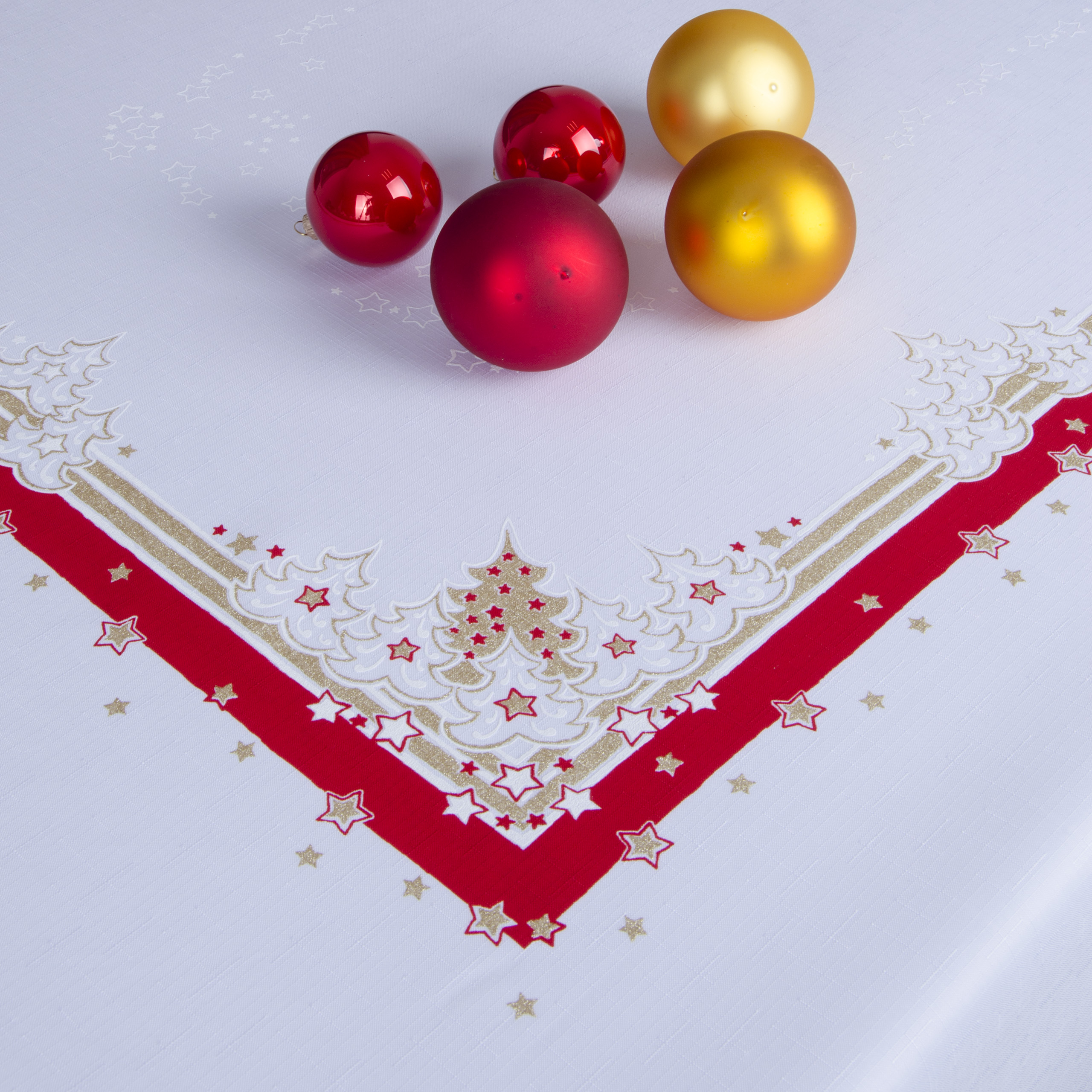 Kolekcja świąteczna wykonana jest z wysokogatunkowej, plamoodpornej tkaniny poliestrowej. Obrusy wykończone są wokół w ząbek na maszynach ultrasonicznych.