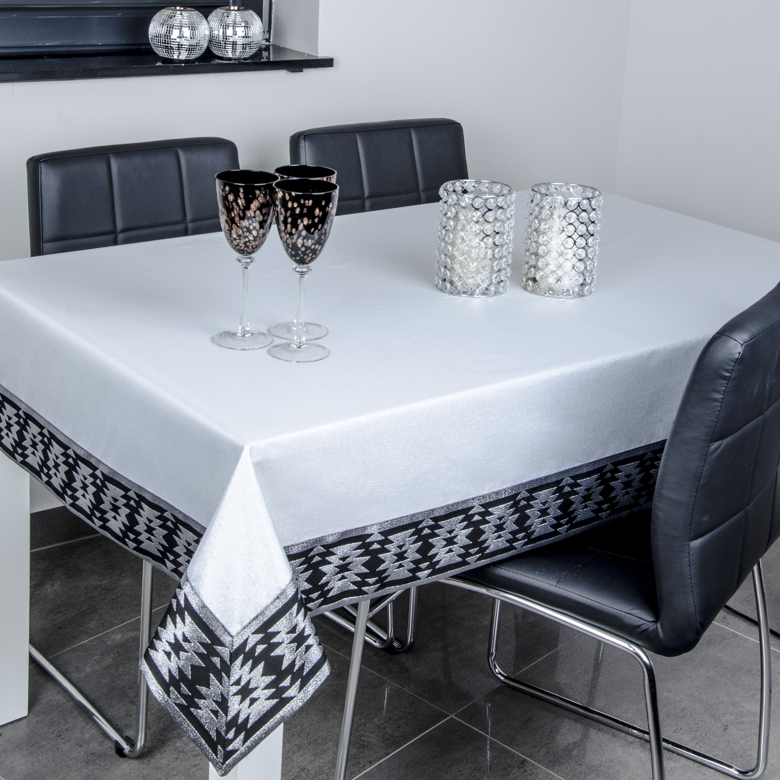 VEGA LUX BROKAT to wyjątkowa kolekcja atłasowych obrusów wykończonych ozdobną listwą o szerokości 10 cm, tkaną metalizowaną nitką w kolorze srebrnym lub złotym z oryginalnym wzorem azteckim.