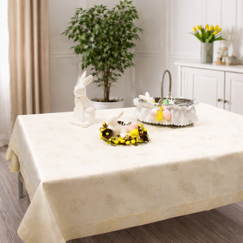 Gold Silver Wielkanoc obrusy te nadają wyjątkowego charakteru w Twoim domu. Wykonane są z żakardowej tkaniny z dodatkiem nitki metalizowanej w kolorze złotym oraz są wykończone elegancką listwą o szerokości 5 cm. Obrusy zdobi piękny motyw świąteczny, który nada magiczny klimat wnętrzu. Doskonale prezentują się po jednej, jak i po drugiej stronie. Komponują się z kontrastującymi dodatkami, takimi jak zastawa stołowa, sztućce czy świeczniki. Są łatwe w utrzymaniu, kolory nie tracą swojej barwy, a więc obrus zachowuje swoje walory przed długi czas użytkowania.