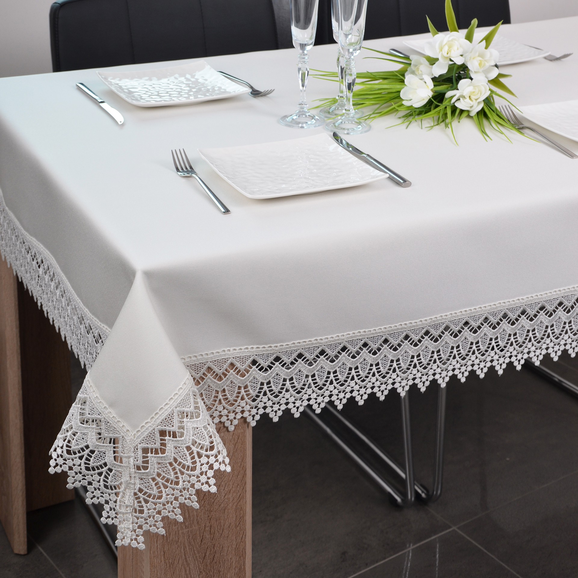 GŁADKIE OBRUSY Z GIPIURĄ to wyjątkowa kolekcja gładkich, klasycznych obrusów wykończonych ozdobną gipiurą o szerokości 9 cm. Dekoracyjna gipiura nadaje obrusowi eleganckiego szyku oraz wyjątkowego designu.