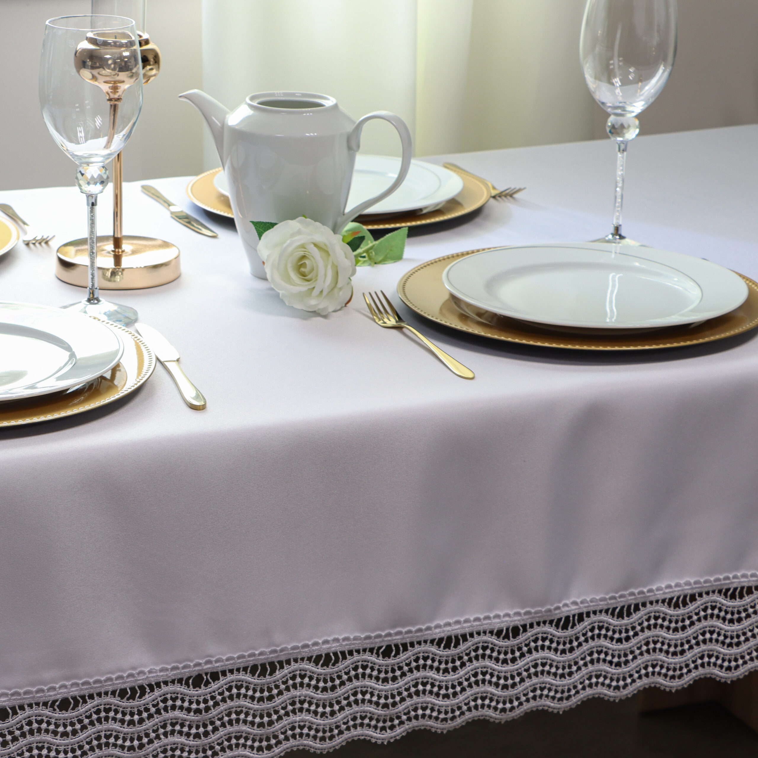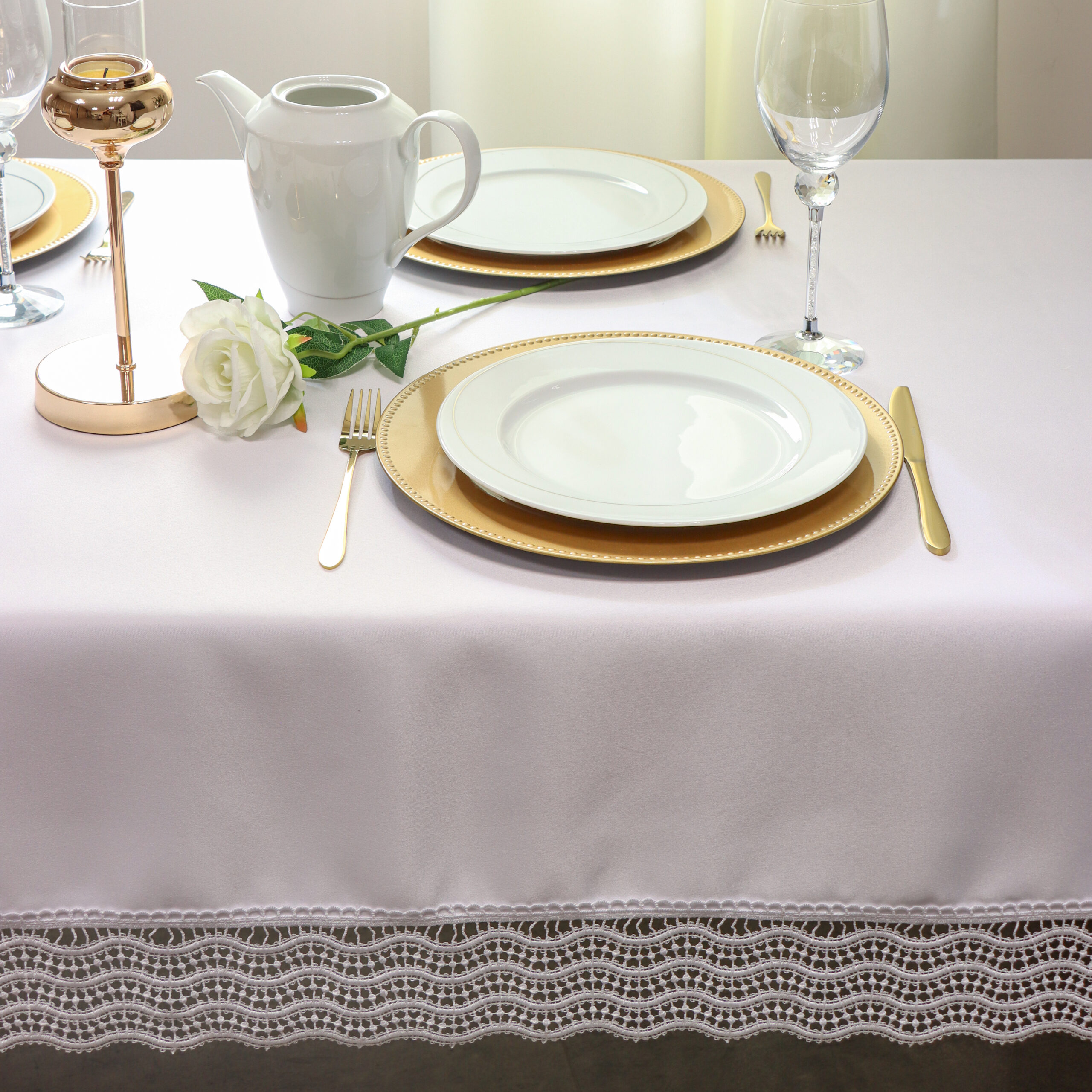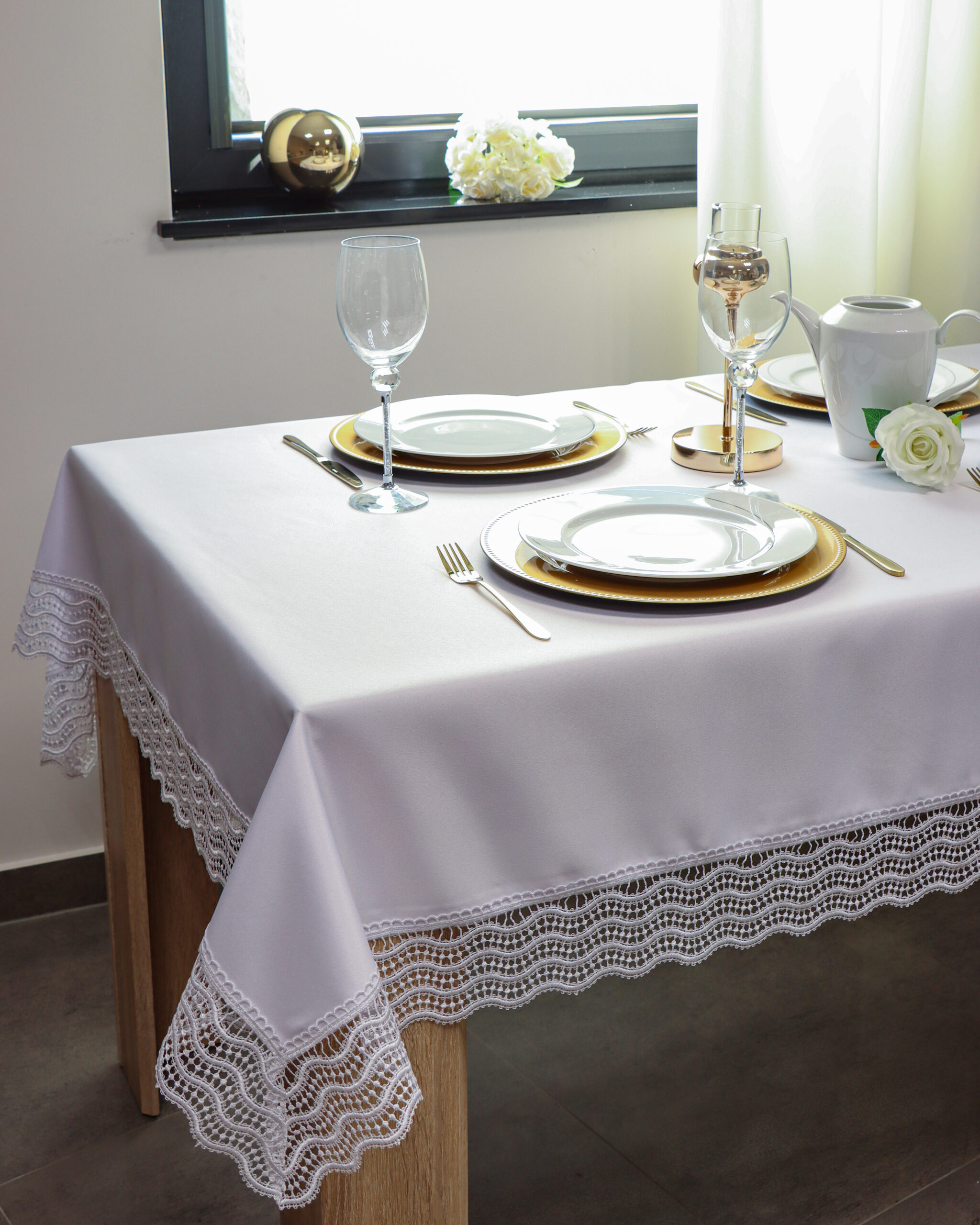 GŁADKIE OBRUSY Z GIPIURĄ to wyjątkowa kolekcja gładkich, klasycznych obrusów wykończonych ozdobną gipiurą o szerokości 9 cm. Dekoracyjna gipiura nadaje obrusowi eleganckiego szyku oraz wyjątkowego designu.