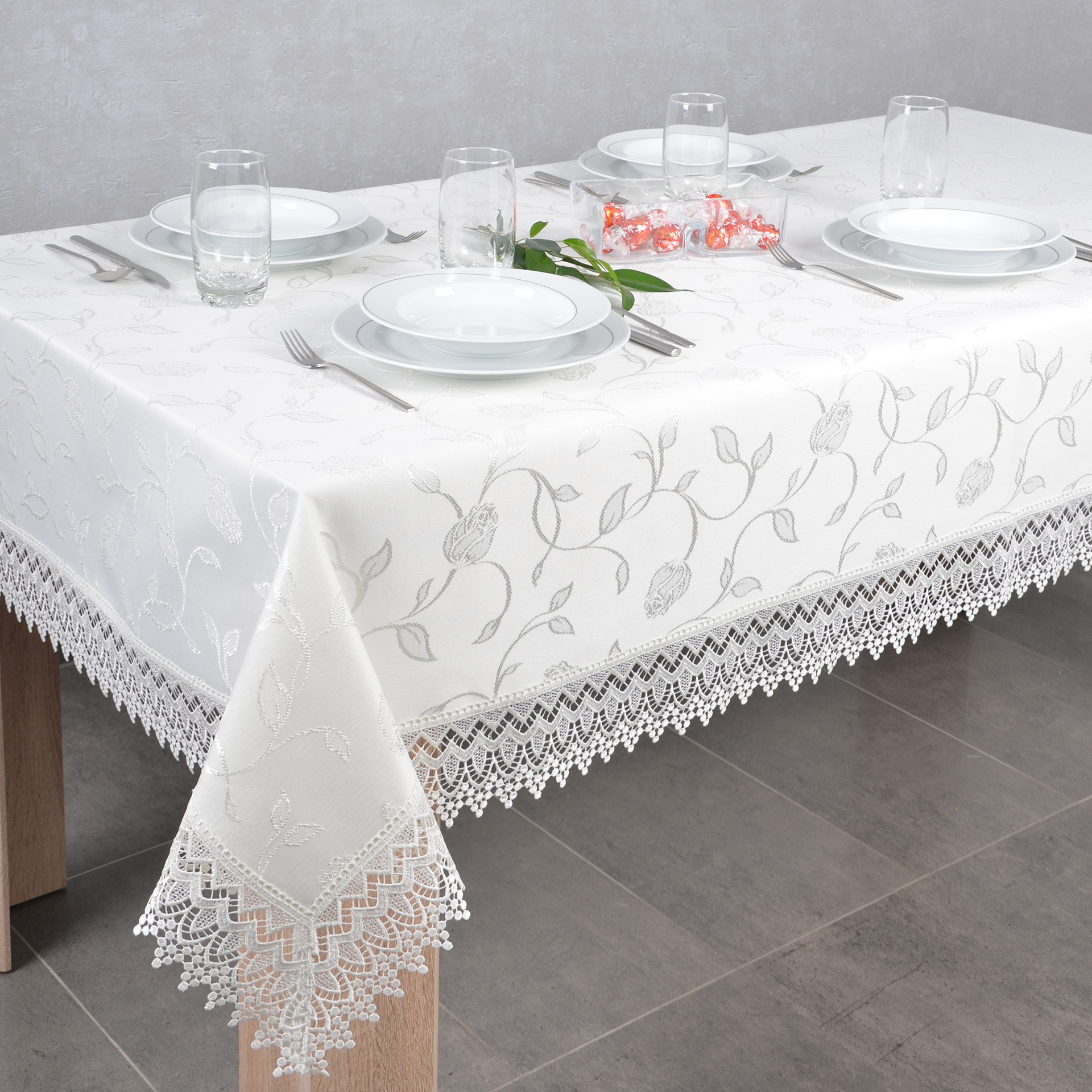 Obrusy z GIPIURĄ tkanina 127 to wyjątkowa kolekcja żakardowych obrusów wykończonych ozdobną gipiurą o szerokości 9 cm. Dekoracyjna gipiura nadaje obrusowi eleganckiego szyku oraz wyjątkowego designu. Obrusy dostępne są w wielu kolorach oraz rozmiarach, dlatego dopasowanie nie będzie stanowiło problemu.