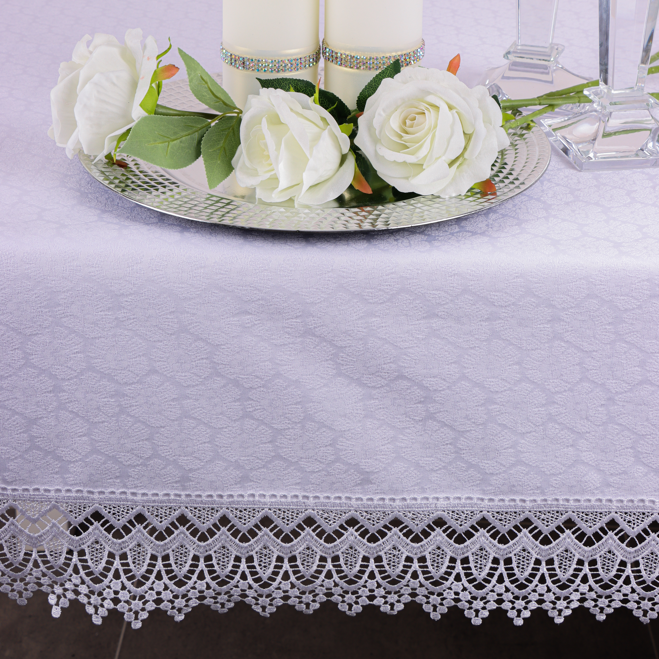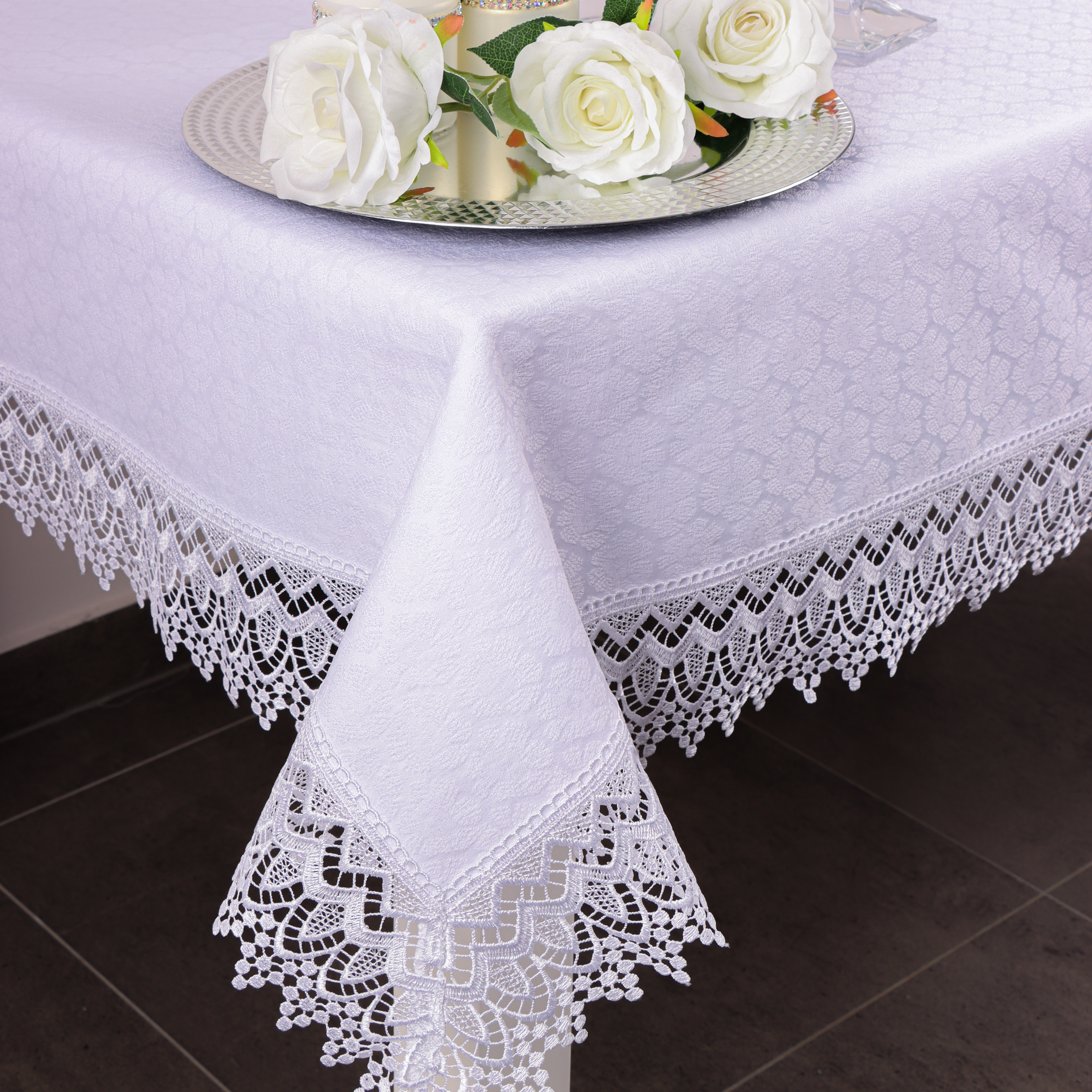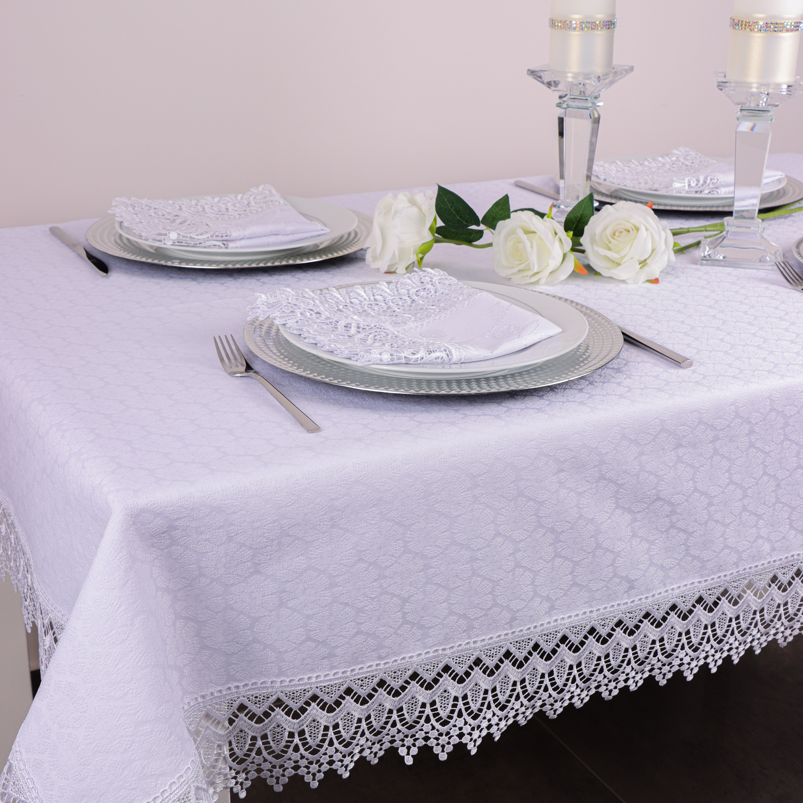 Obrus z Gipiurą ŻAKARD – to niezwykle elegancka kolekcja białych obrusów wykończonych ozdobną gipiurą o szerokości 9cm. Dekoracyjna koronka, gipiura nadaje obrusowi eleganckiego szyku oraz wyjątkowego designu.