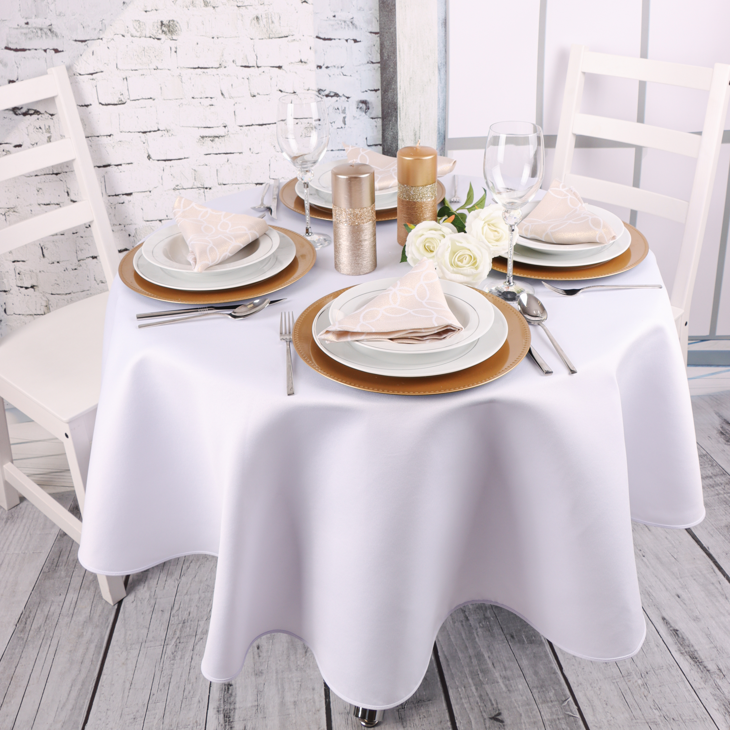 Okrągły biały obrus z białą lamówką