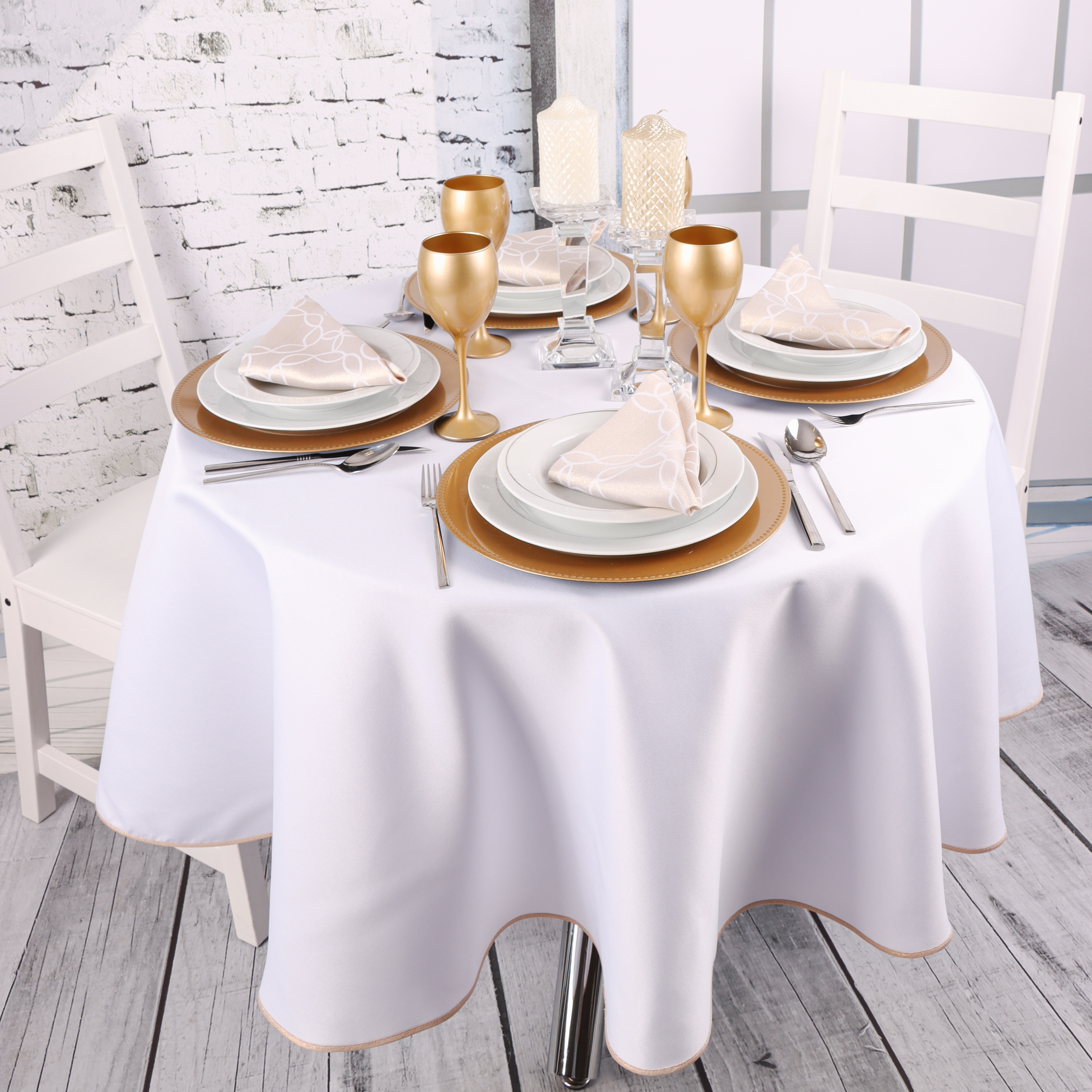 Okrągły biały obrus ze złotą lamówką