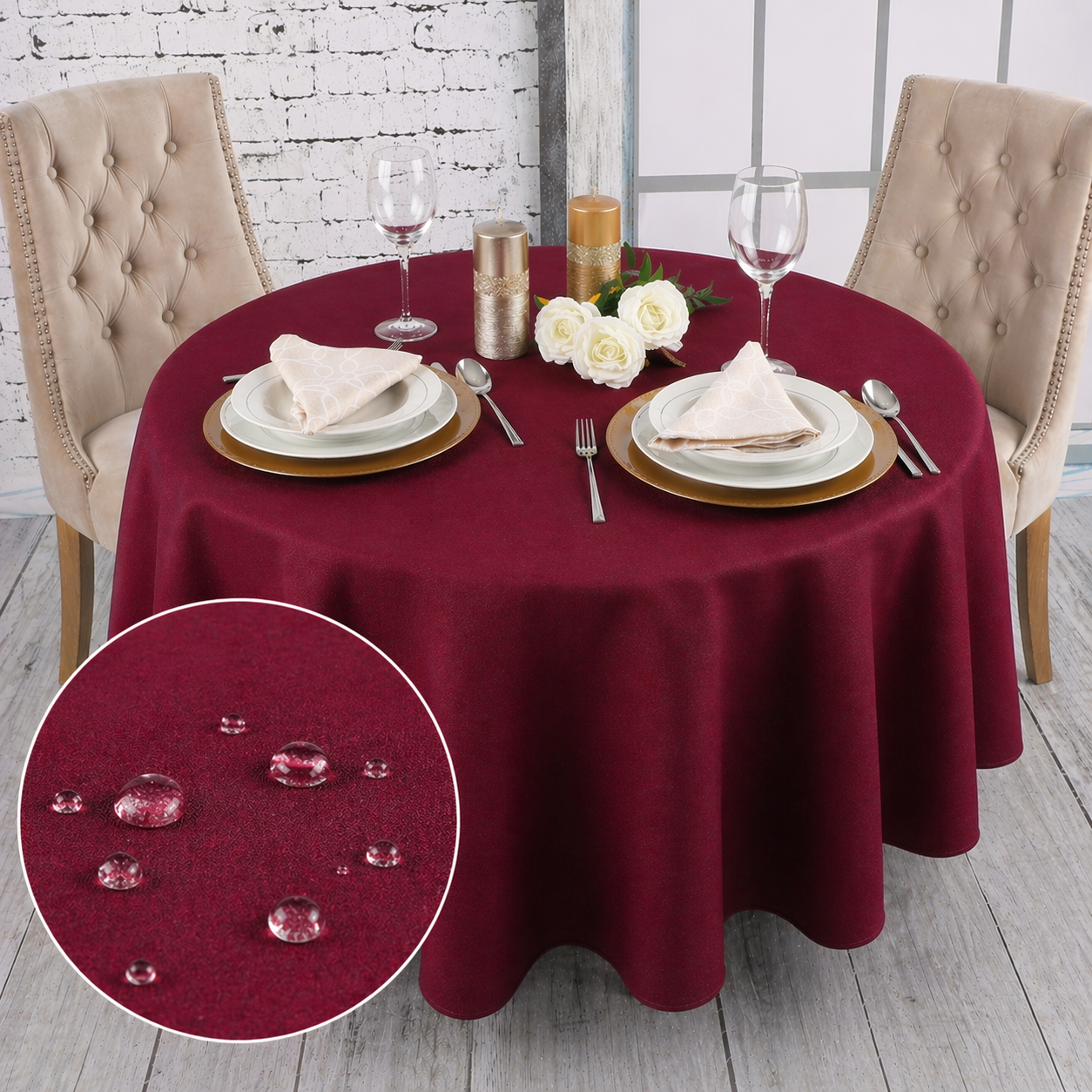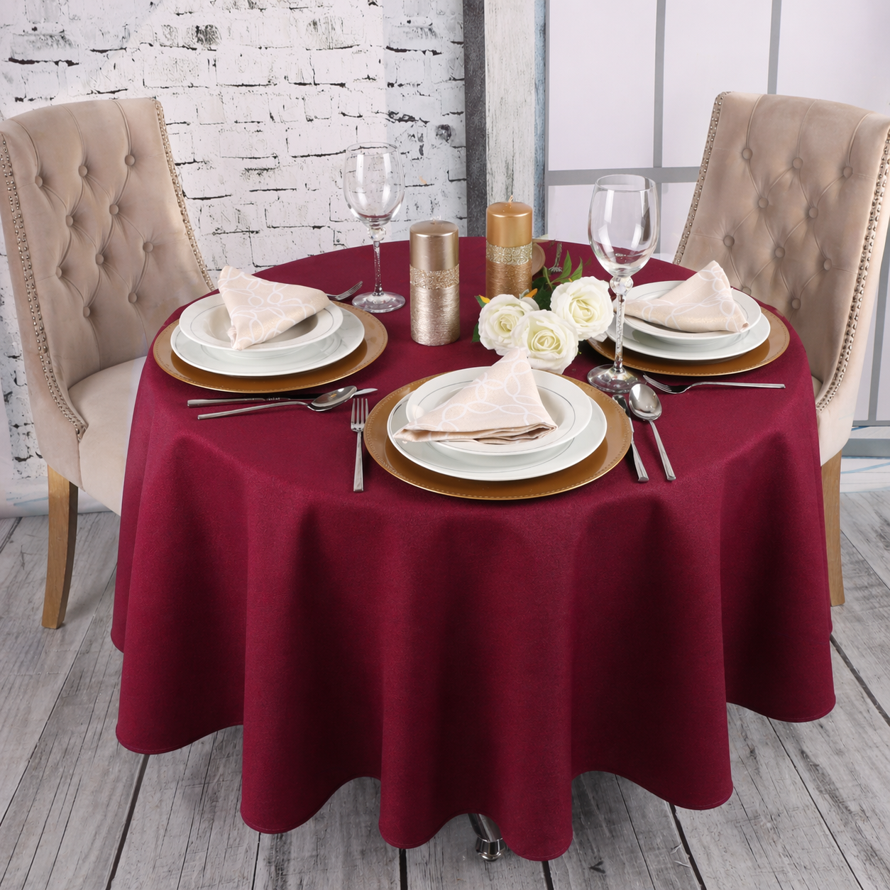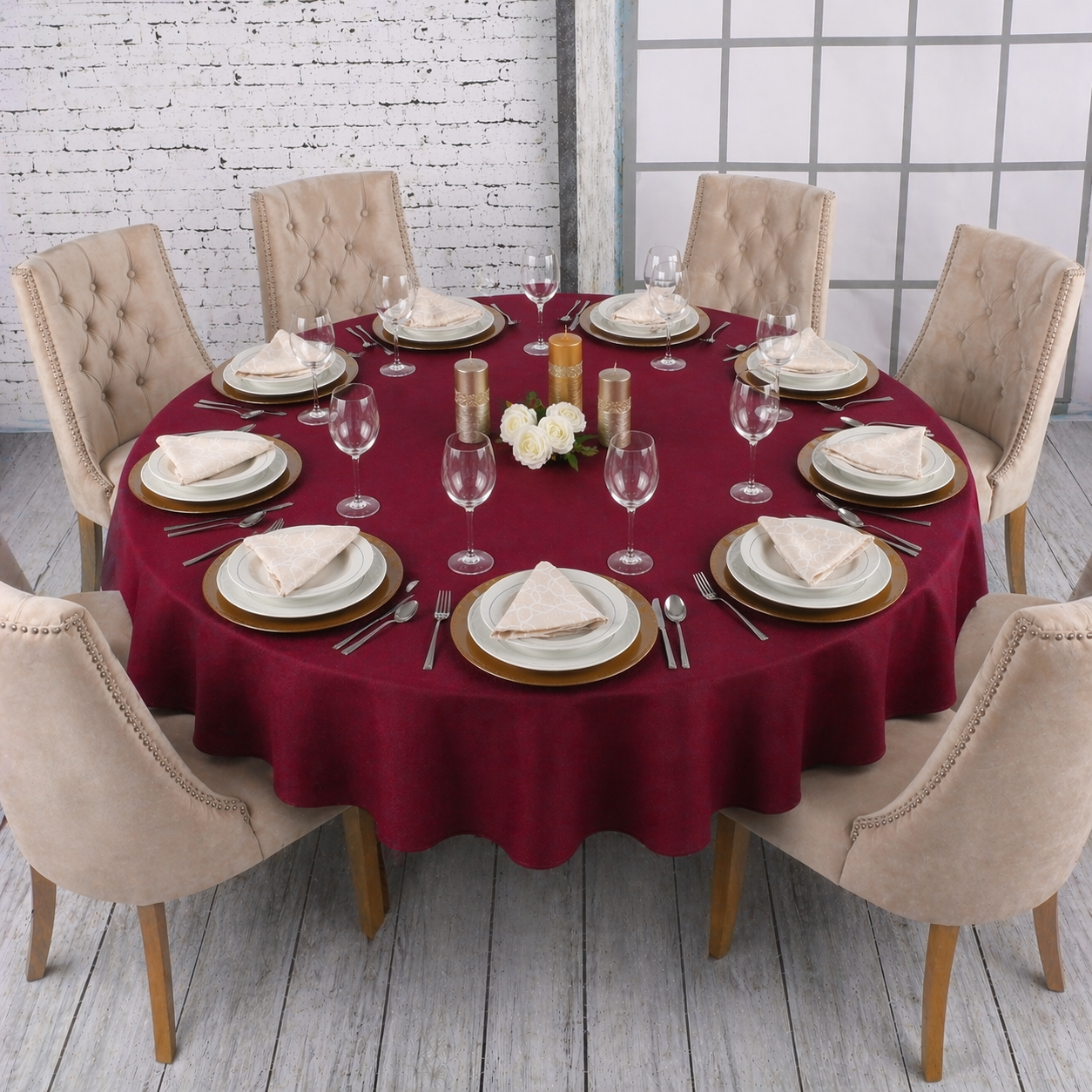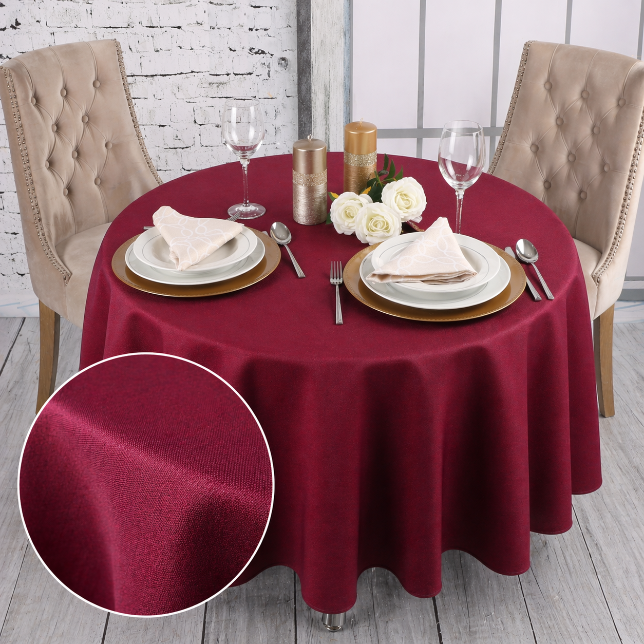 Okrągły obrus bordowy– klasyka w nowoczesnym wydaniu, idealna zarówno na intymne kolacje, jak i wyjątkowe uroczystości. Ta subtelna kombinacja dodaje elegancji każdemu wnętrzu, sprawiając, że stół staje się centralnym punktem każdego wydarzenia.