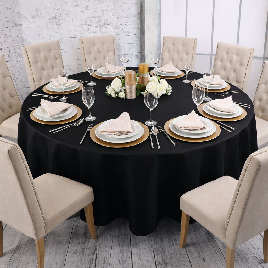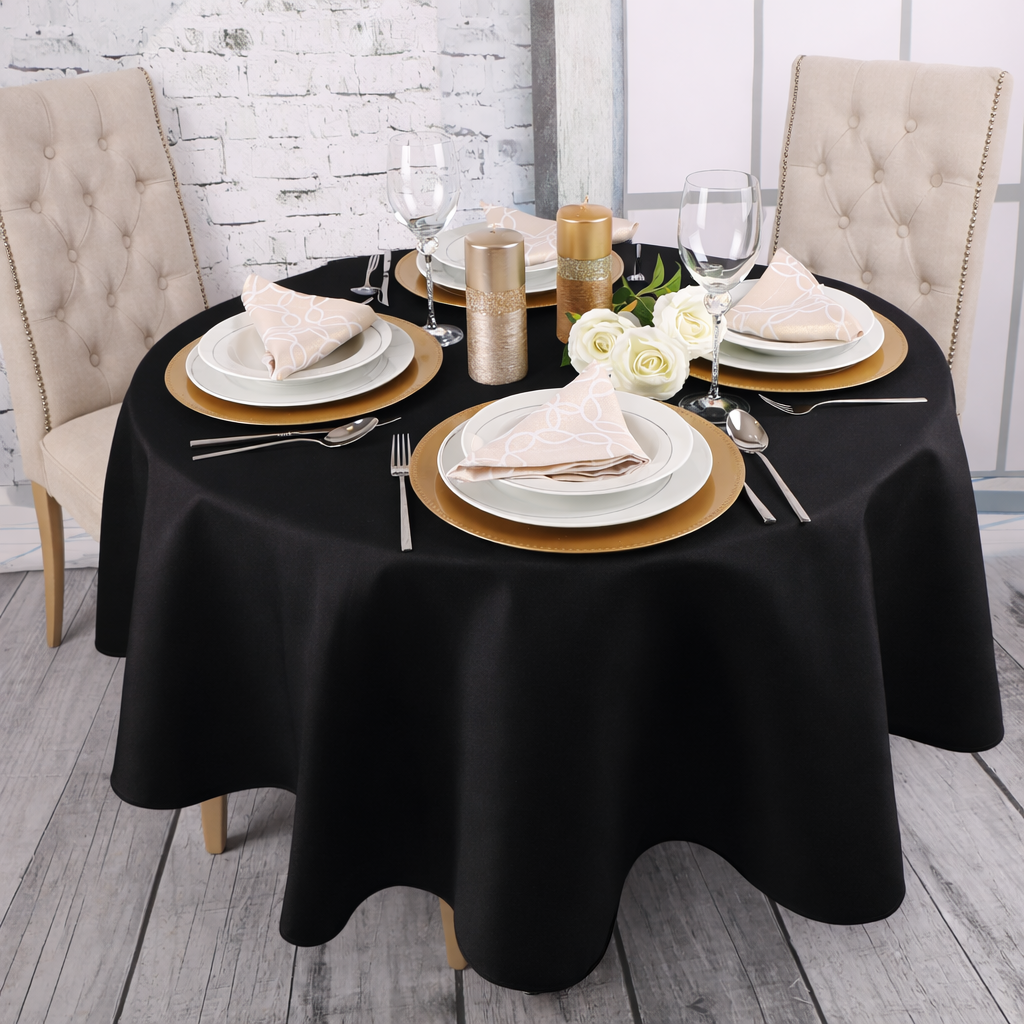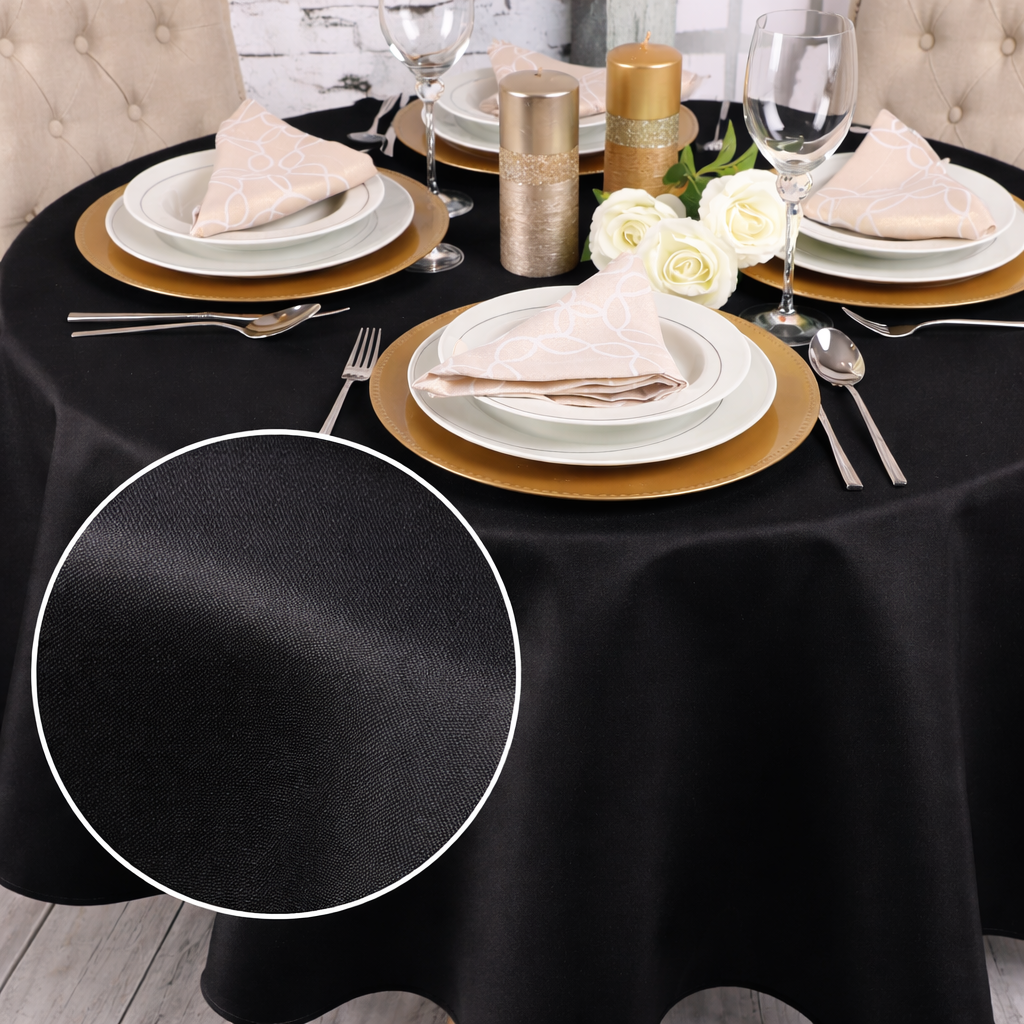 Okrągły obrus czarny – klasyka w nowoczesnym wydaniu, idealna zarówno na intymne kolacje, jak i wyjątkowe uroczystości. Ta subtelna kombinacja dodaje elegancji każdemu wnętrzu, sprawiając, że stół staje się centralnym punktem każdego wydarzenia.