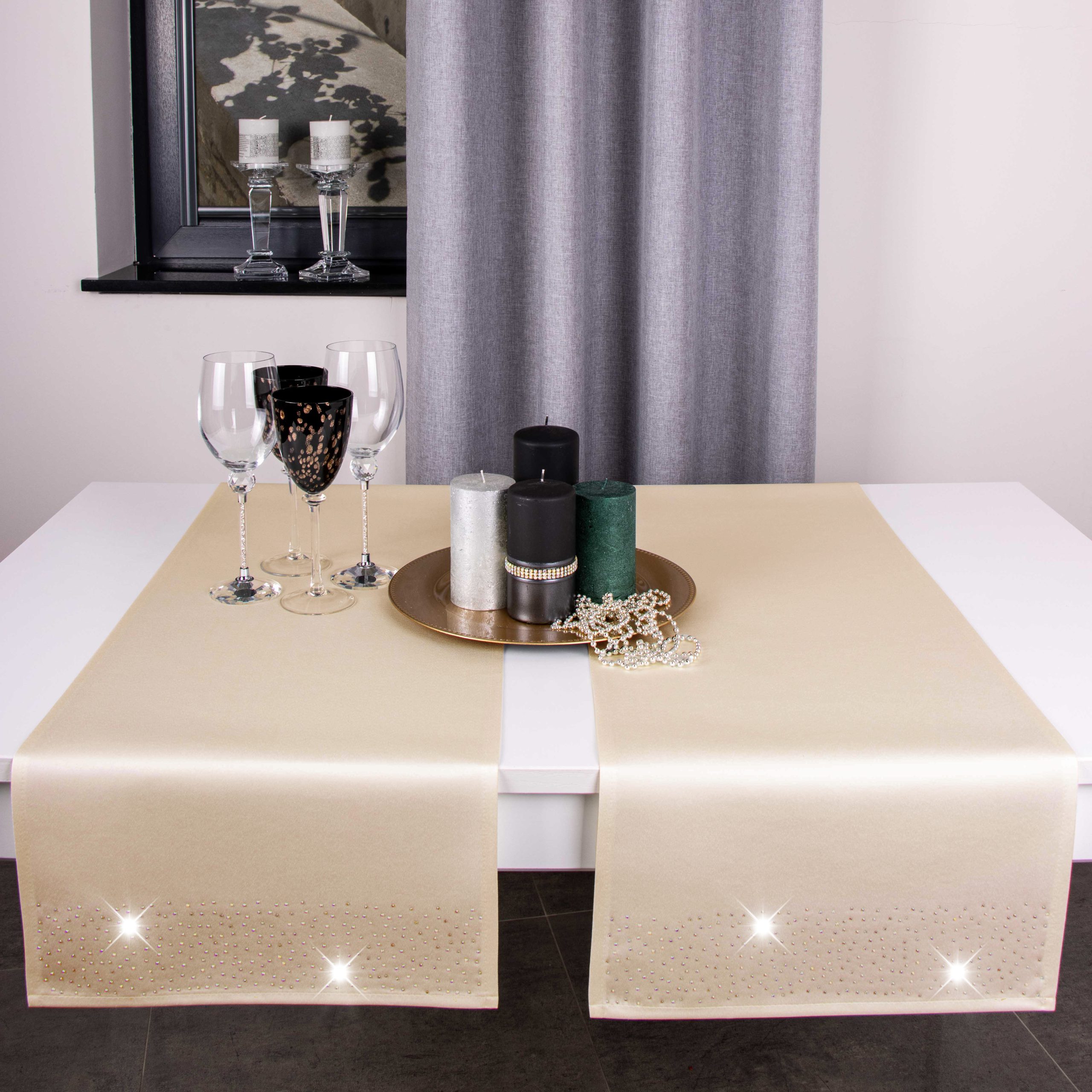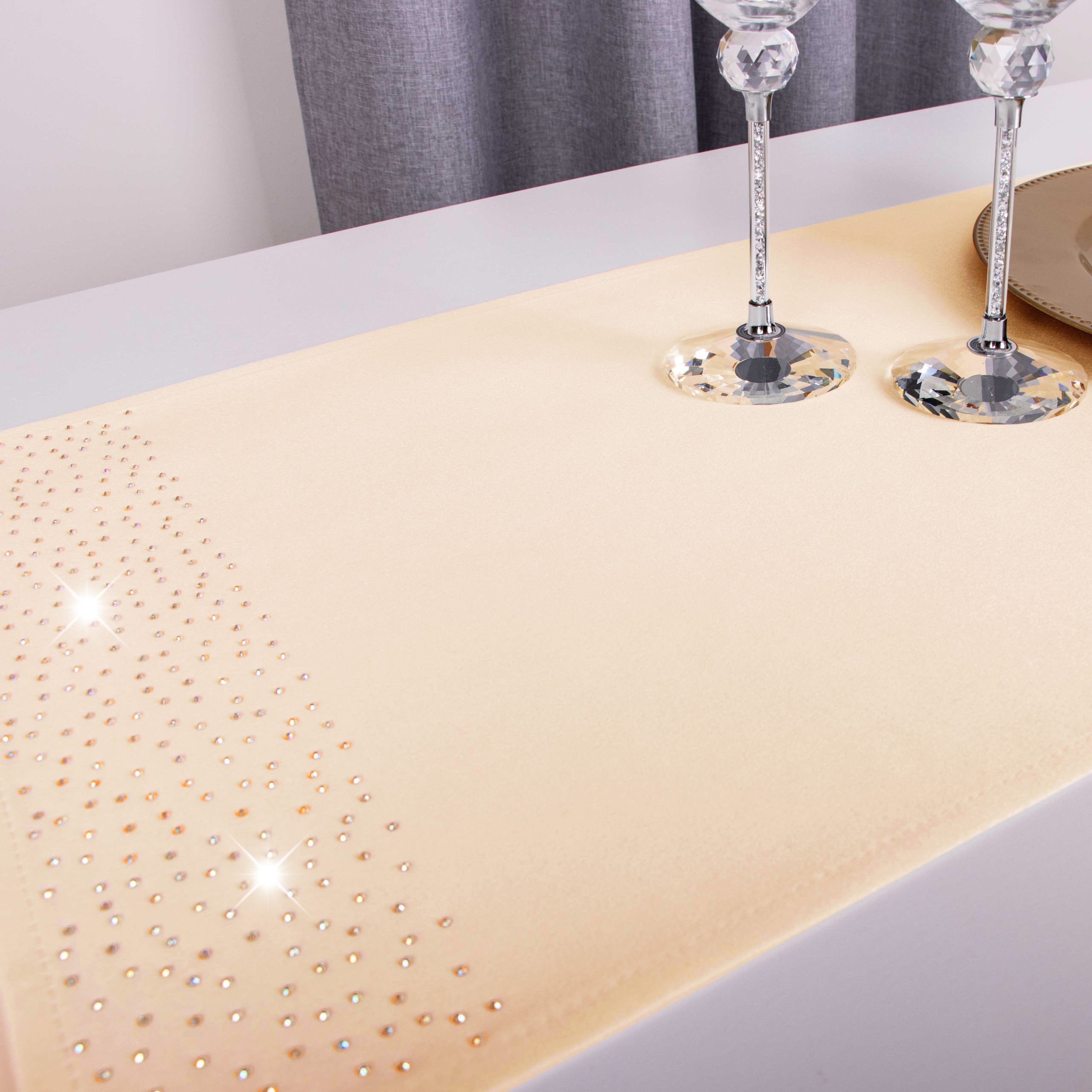 Pasy doskonale pasują do większości salonów i jadalni, ale znajdą również zastosowanie w restauracjach, hotelach oraz kafejkach. Ich niepowtarzalny wygląd idealnie komponuje się z kontrastującymi dodatkami takimi jak zastawa stołowa, sztućce czy świeczniki. Pasy zdobione są na obu końcach kryształkami.