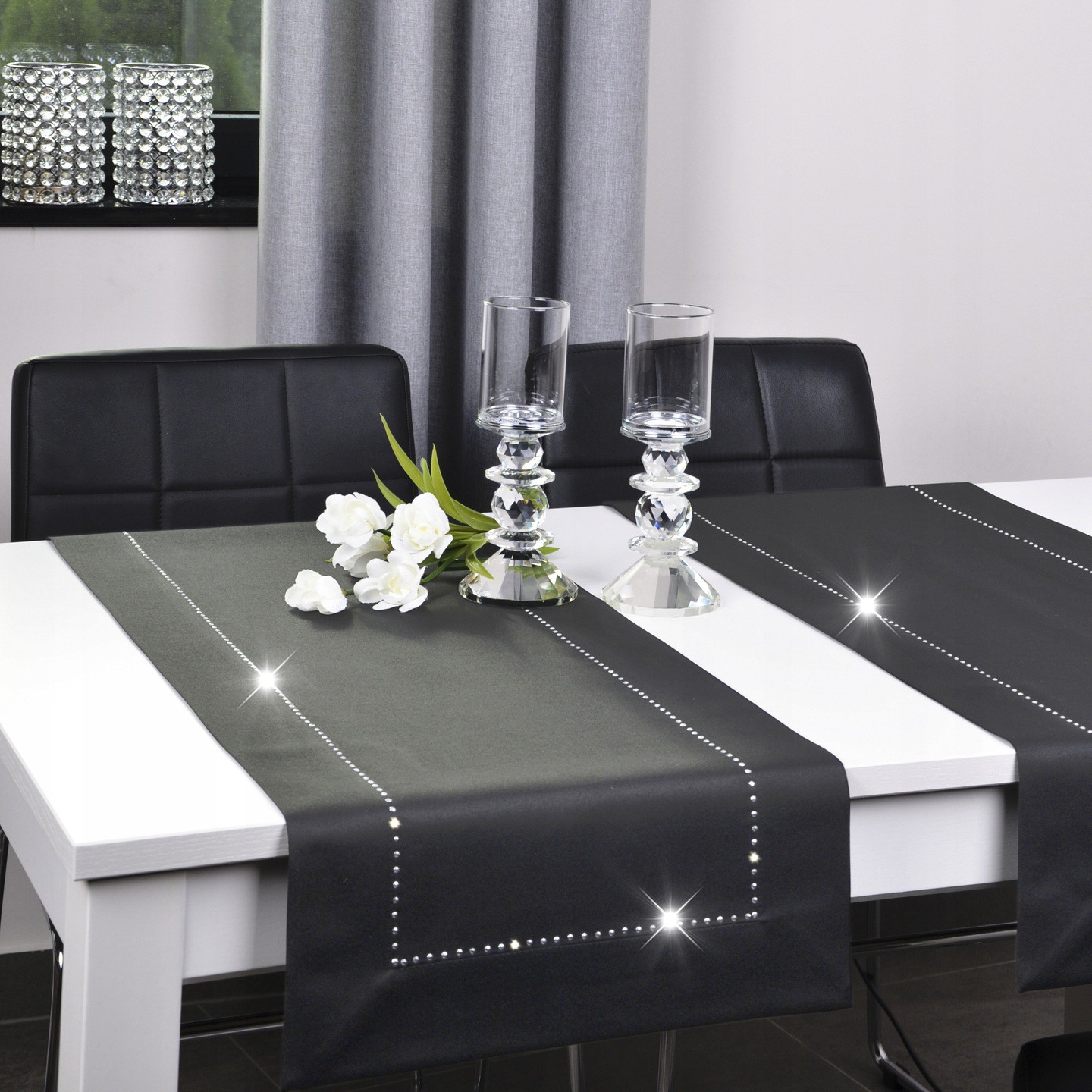 GLAMOUR to wyjątkowa kolekcja atłasowych bieżników wykończonych ozdobną listwą o szerokości 7 cm, wzdłuż obszycia ozdobione są nowoczesnym wzorem wykonanym z metalowych, srebrnych dżetów.
