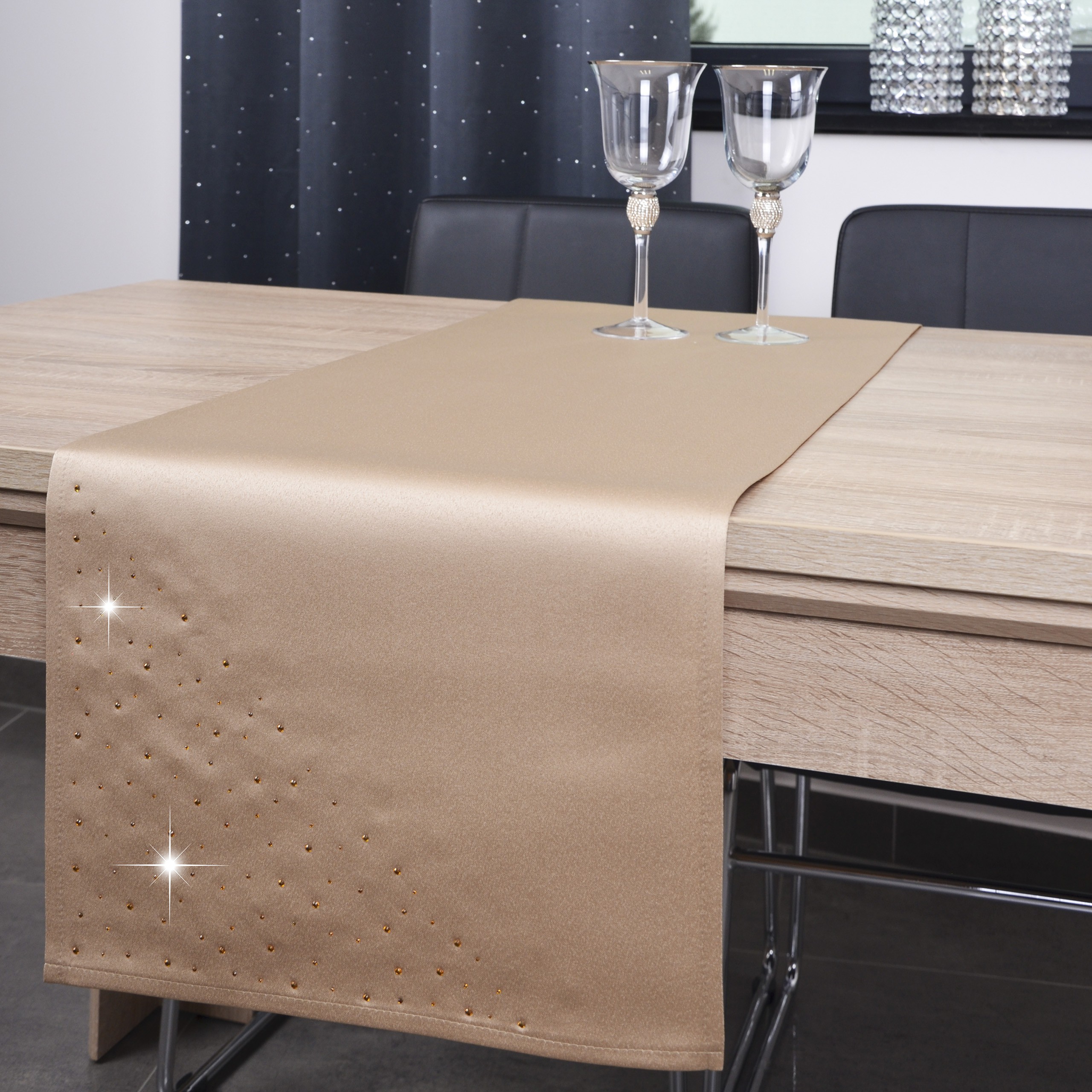 KRYSTAL to wyjątkowa kolekcja atłasowych bieżników, które wykończone są estetycznym podłożeniem na 1 cm oraz ozdobione są nowoczesnym wzorem, wykonanym ze szklanych kryształków, odpowiednio dobranych kolorystycznie. Bieżniki dostępne są w wielu kolorach oraz rozmiarach, dlatego dopasowanie nie będzie stanowiło problemu.