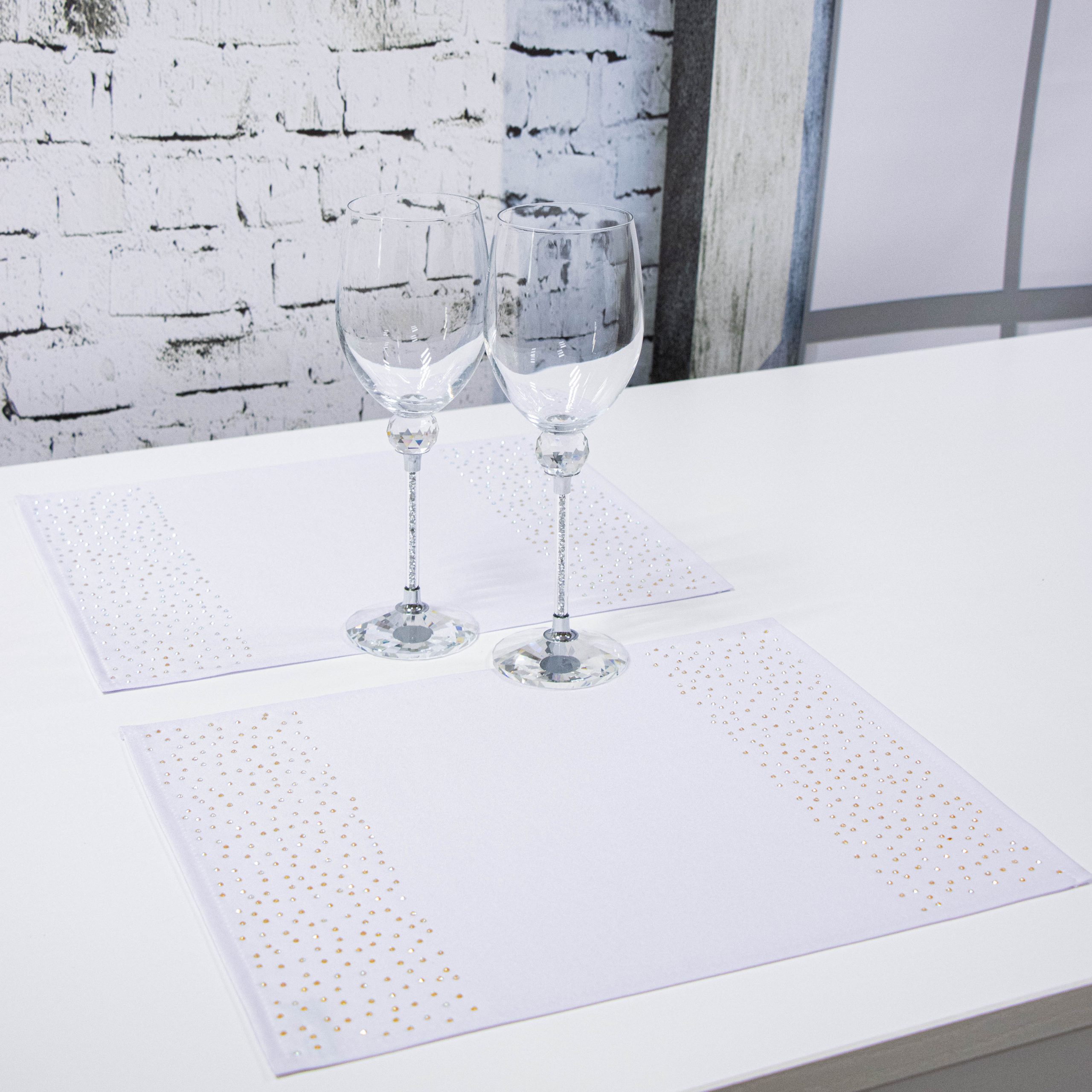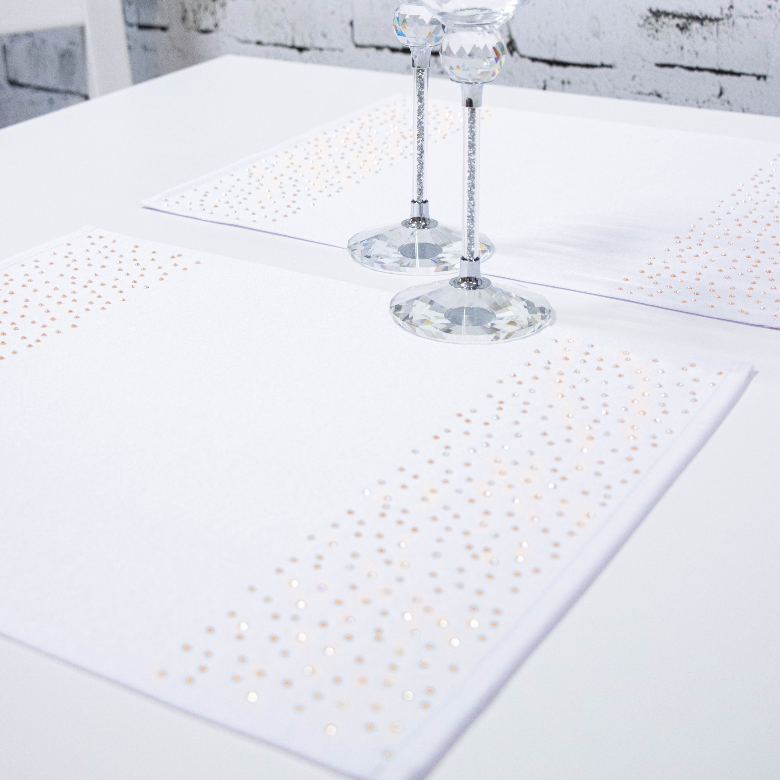 Podkładki doskonale pasują do większości salonów i jadalni, ale znajdą również zastosowanie w restauracjach, hotelach oraz kafejkach. Ich niepowtarzalny wygląd idealnie komponuje się z kontrastującymi dodatkami takimi jak zastawa stołowa, sztućce czy świeczniki. Pasy zdobione są na obu końcach kryształkami.