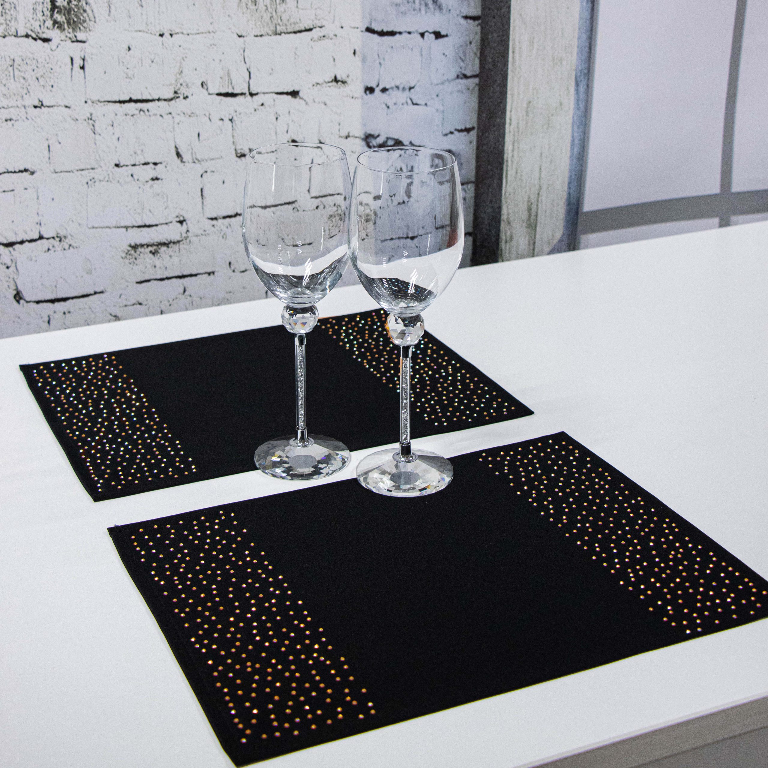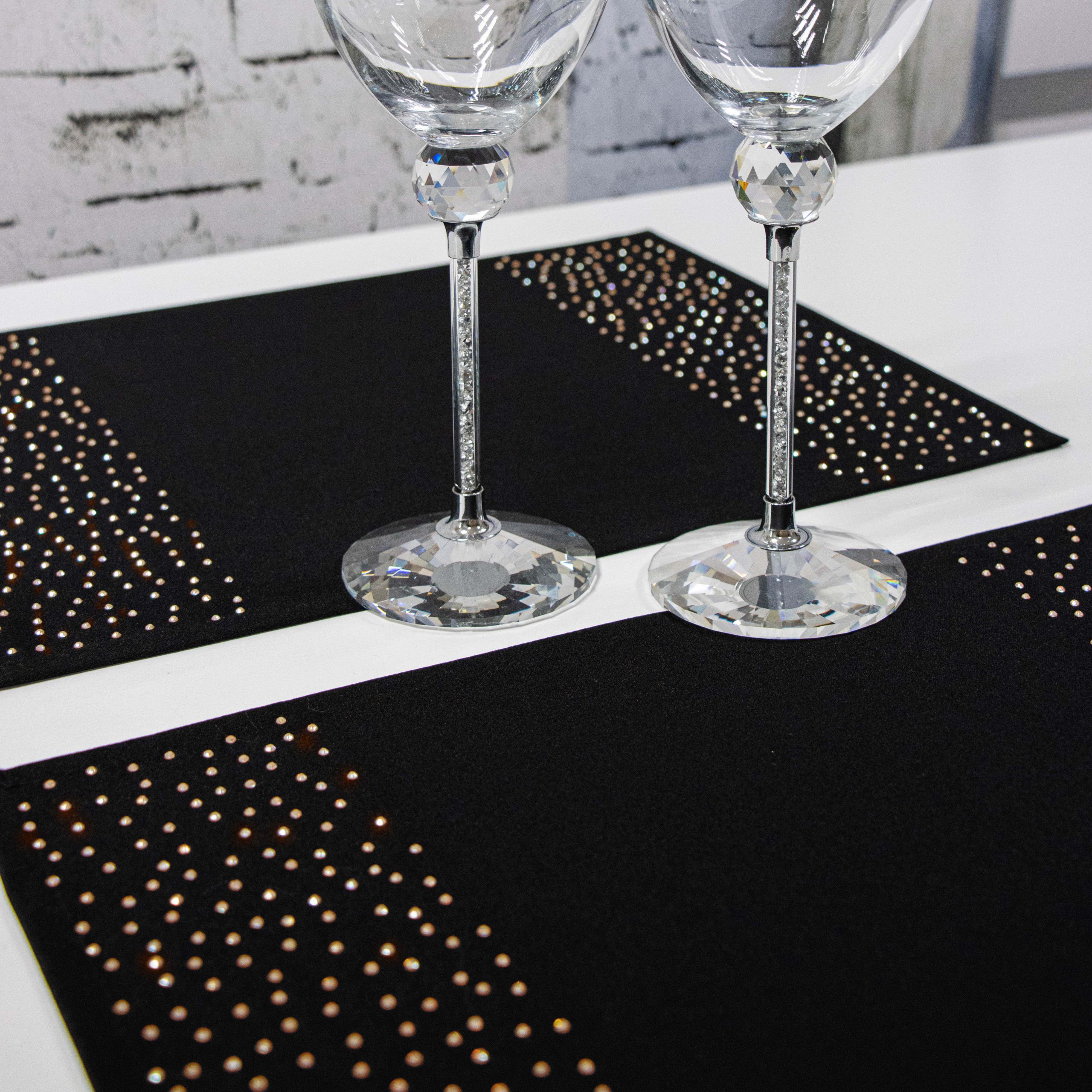 Podkładki doskonale pasują do większości salonów i jadalni, ale znajdą również zastosowanie w restauracjach, hotelach oraz kafejkach. Ich niepowtarzalny wygląd idealnie komponuje się z kontrastującymi dodatkami takimi jak zastawa stołowa, sztućce czy świeczniki. Pasy zdobione są na obu końcach kryształkami.