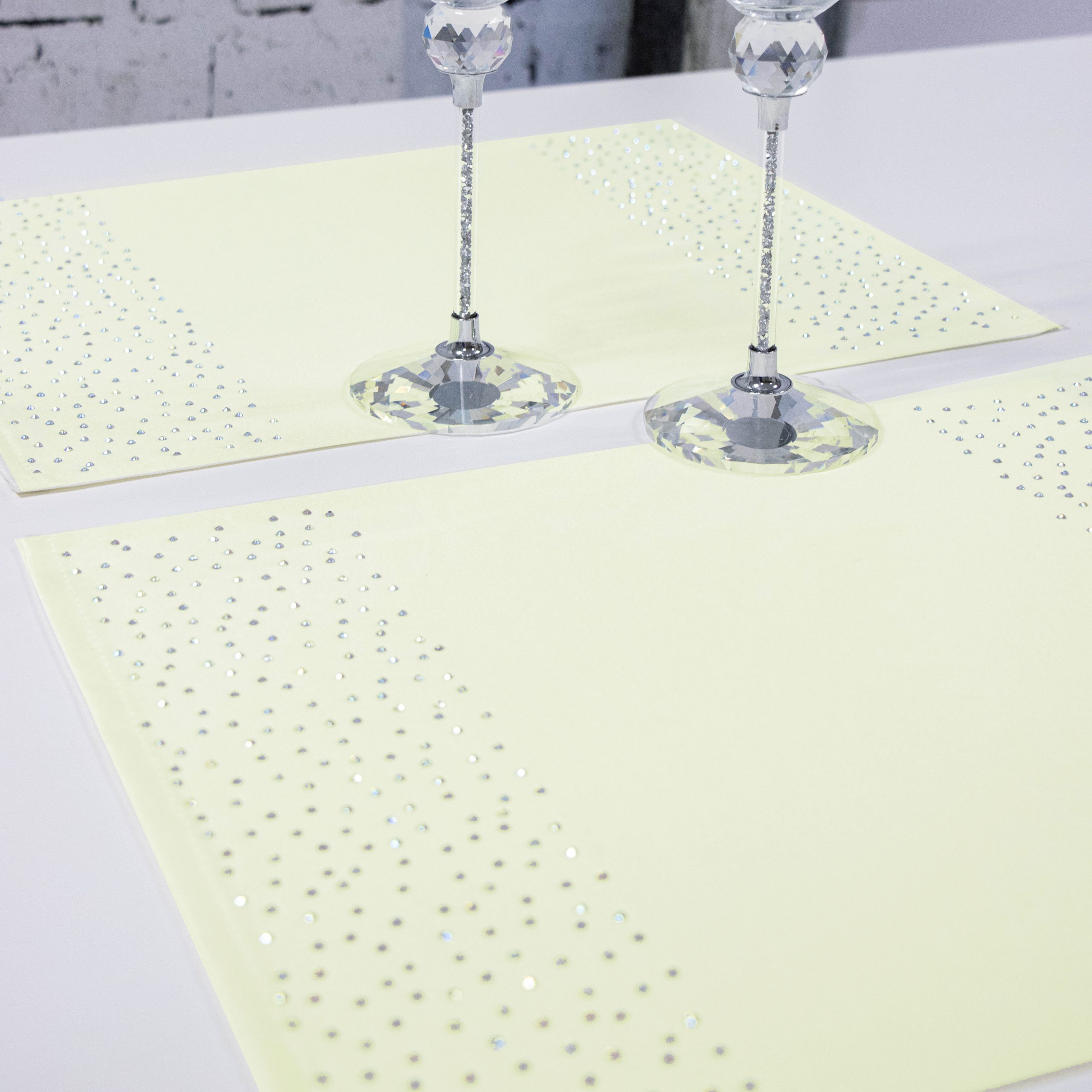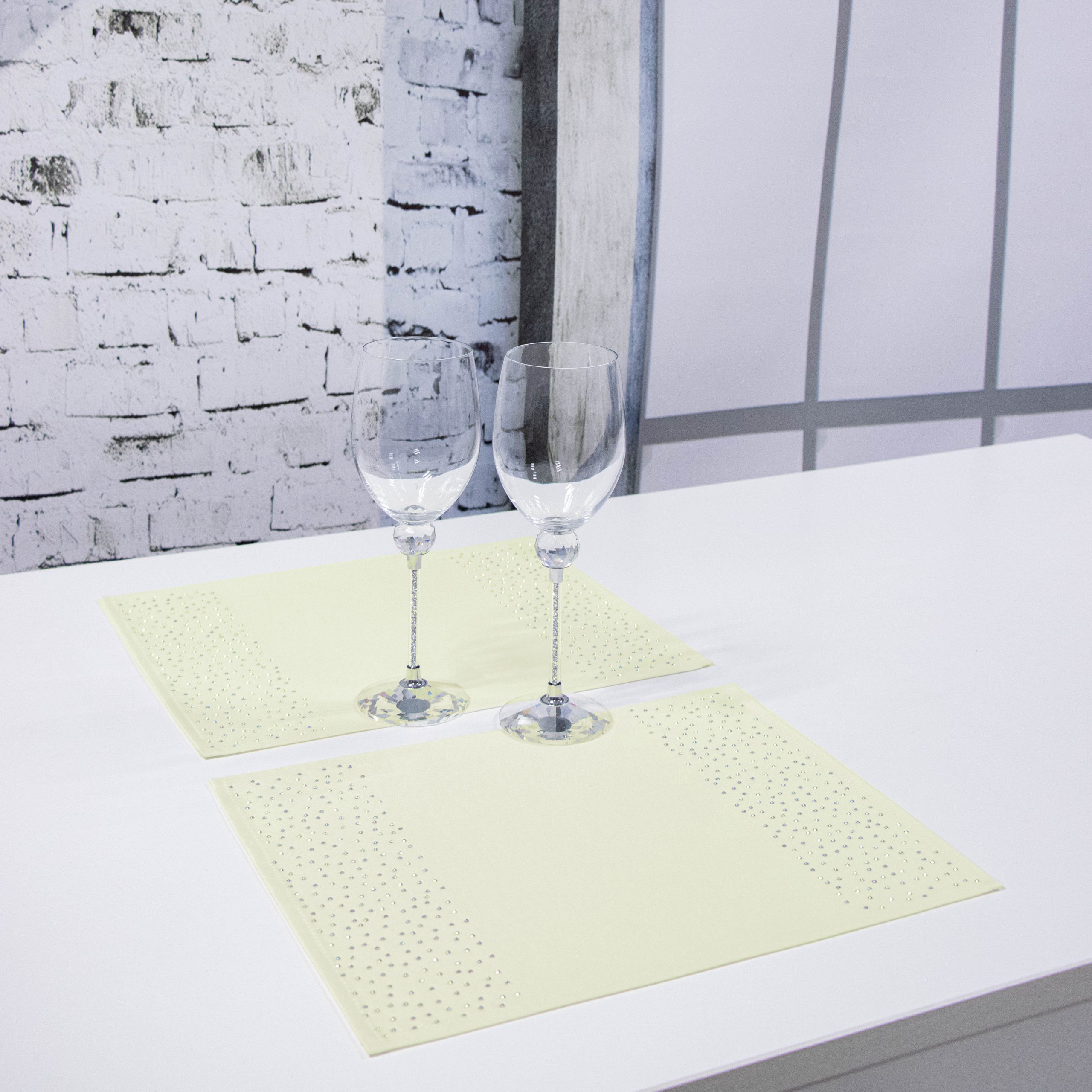 Podkładki doskonale pasują do większości salonów i jadalni, ale znajdą również zastosowanie w restauracjach, hotelach oraz kafejkach. Ich niepowtarzalny wygląd idealnie komponuje się z kontrastującymi dodatkami takimi jak zastawa stołowa, sztućce czy świeczniki. Pasy zdobione są na obu końcach kryształkami.