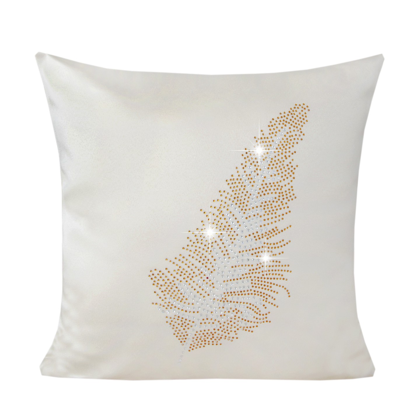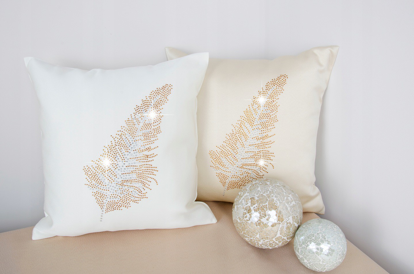 POSZEWKA LIŚĆ – Eleganckie poszewki dekoracyjne wykonane są z wysokogatunkowej tkaniny poliestrowej o splocie atłasowym. Poszewki wysadzane są złotymi dżetami, które podkreślają ich elegancki wygląd.