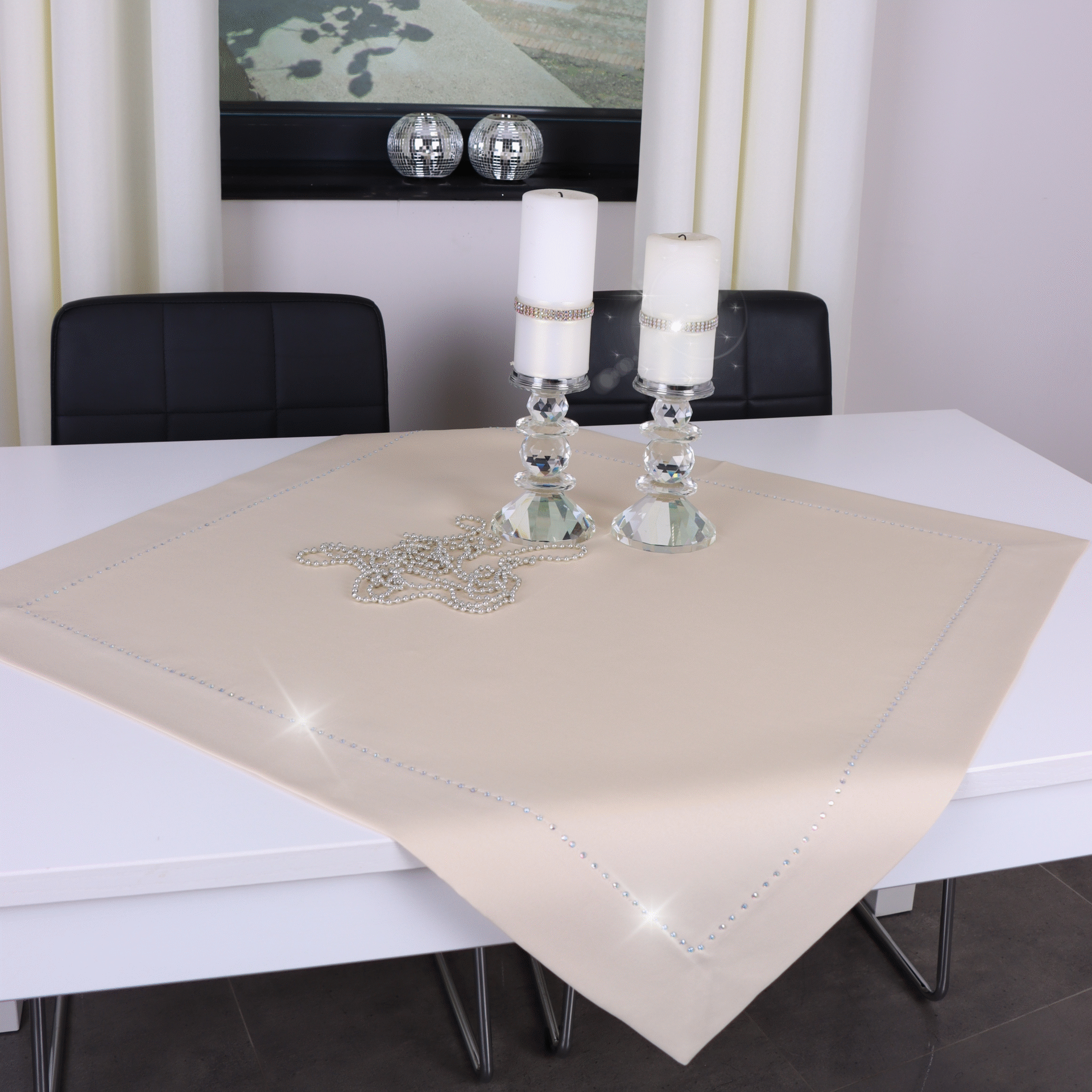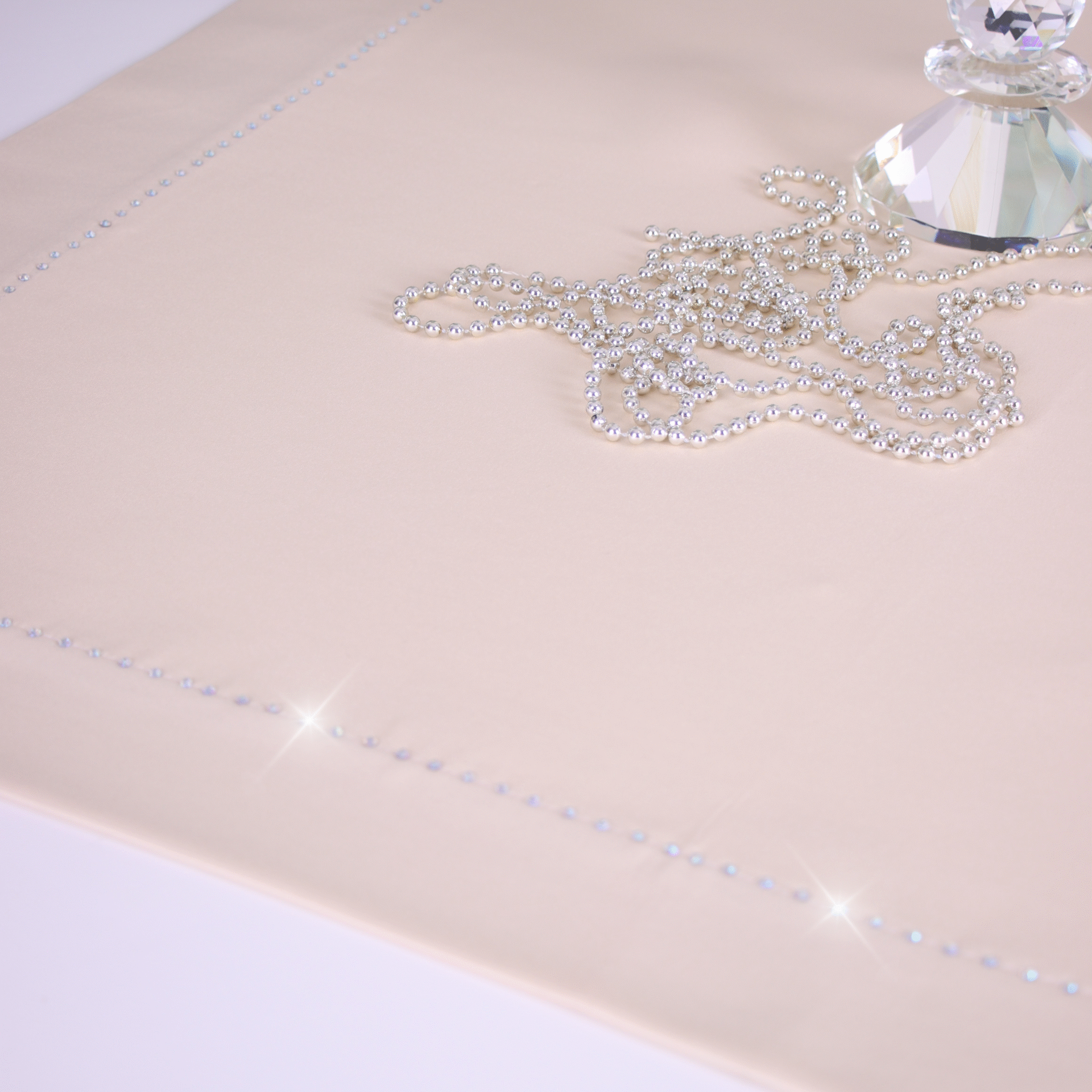 GLAMOUR to wyjątkowa kolekcja atłasowych obrusów wykończonych ozdobną listwą o szerokości 7 cm, wzdłuż obszycia ozdobione są nowoczesnym wzorem wykonanym z metalowych, srebrnych dżetów.