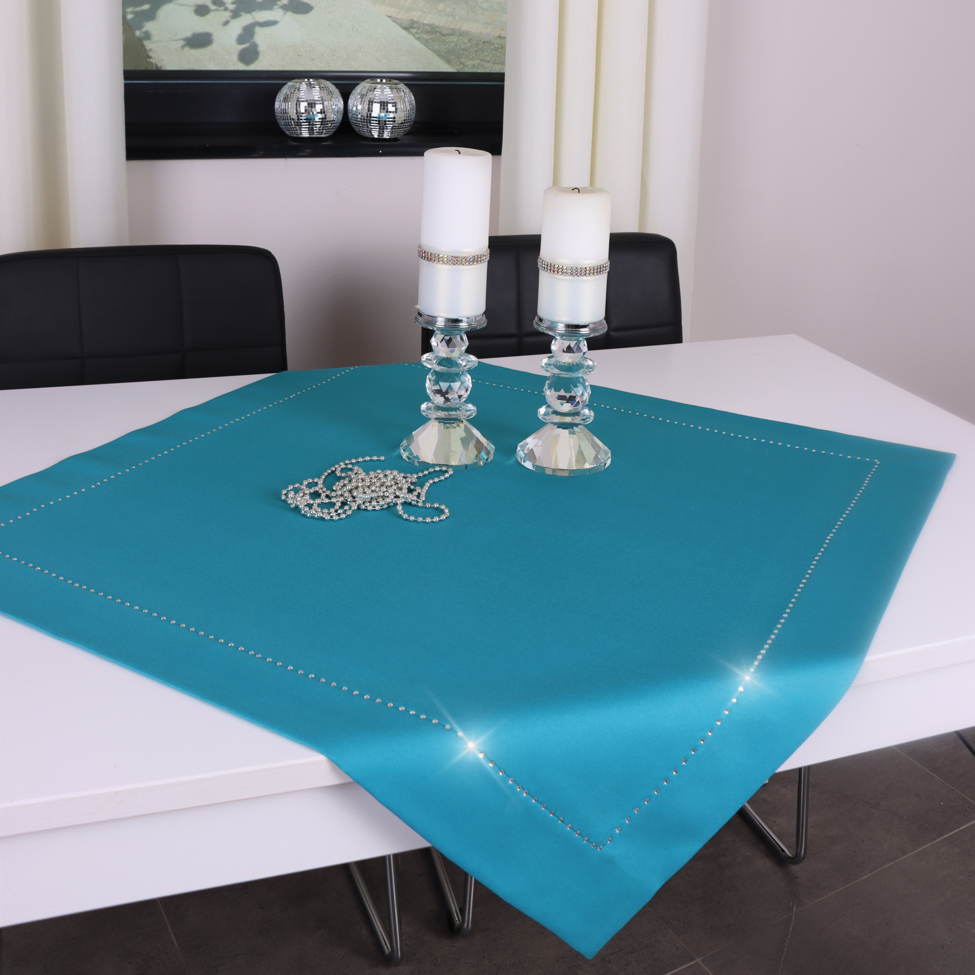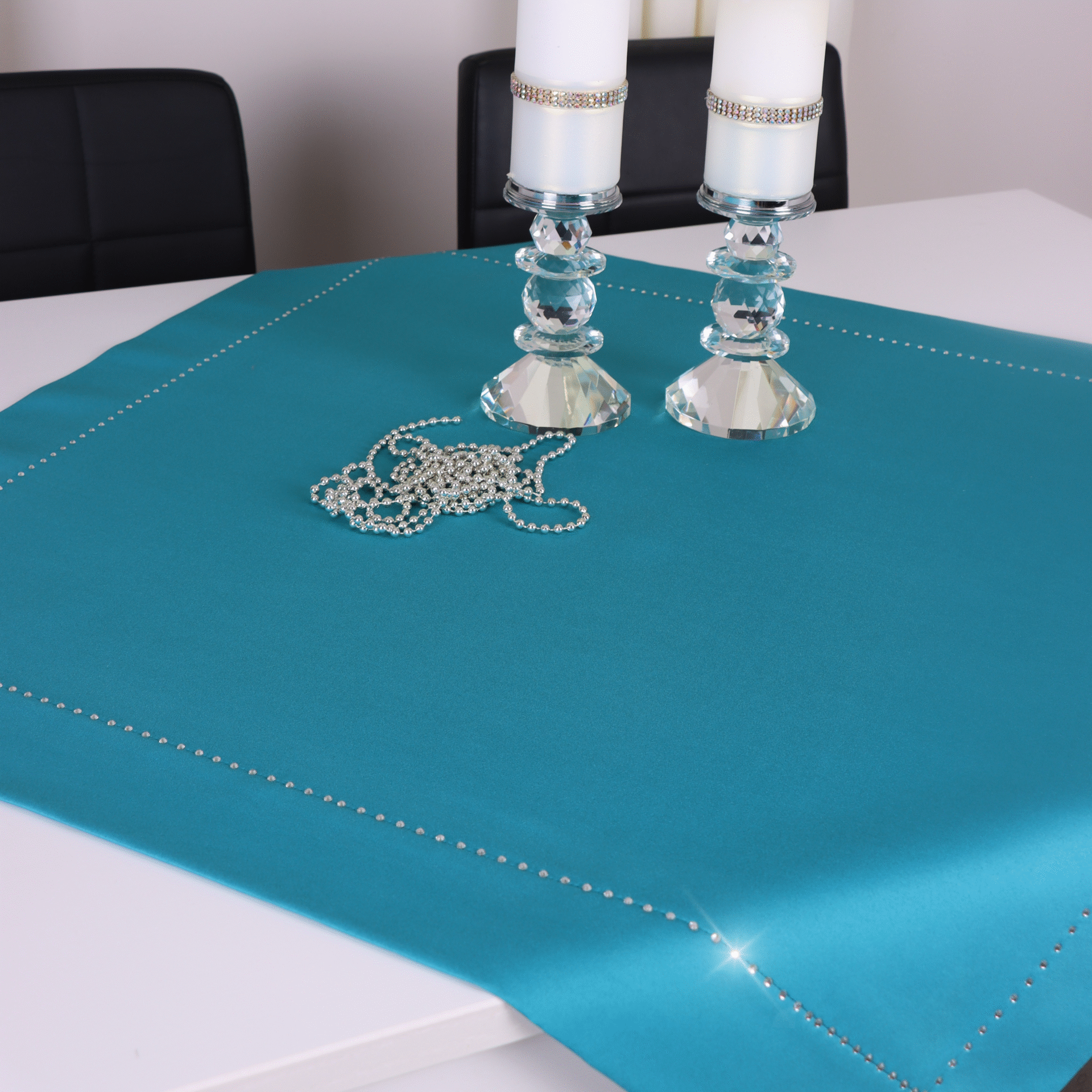 GLAMOUR to wyjątkowa kolekcja atłasowych obrusów wykończonych ozdobną listwą o szerokości 7 cm, wzdłuż obszycia ozdobione są nowoczesnym wzorem wykonanym z metalowych, srebrnych dżetów.