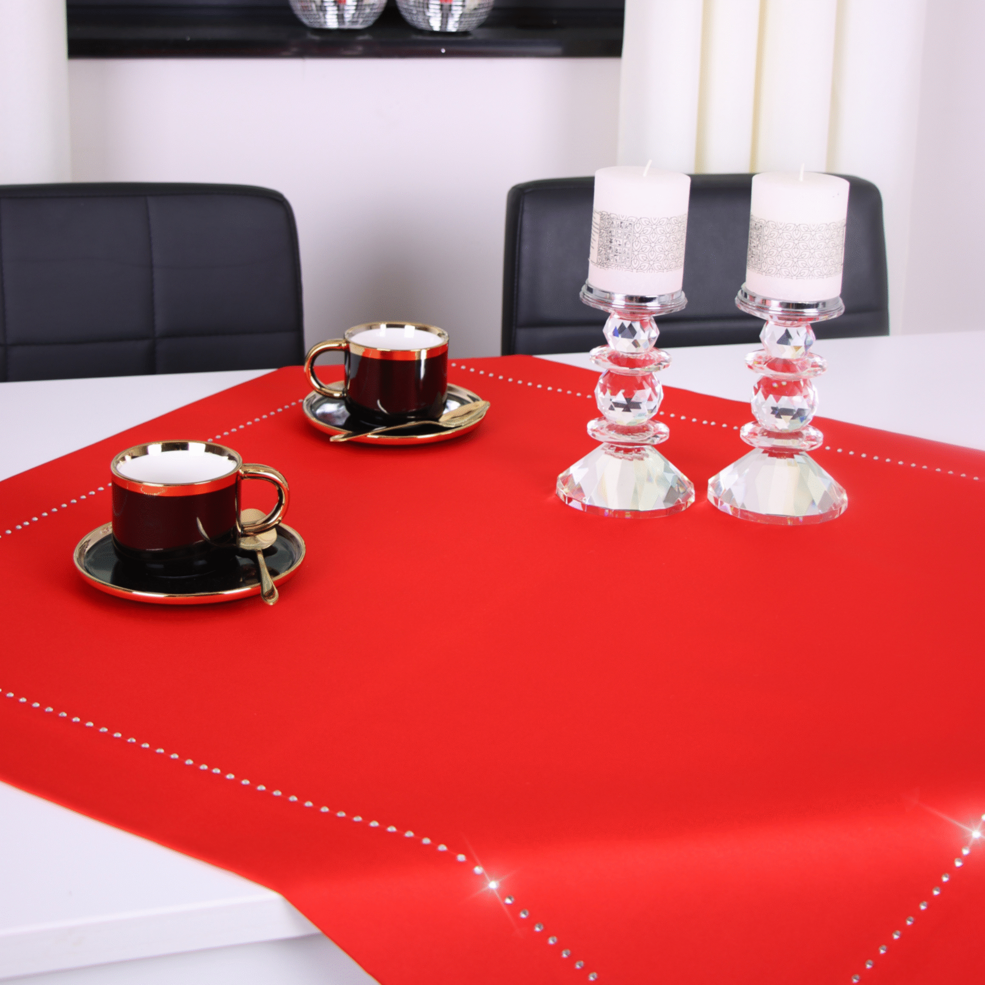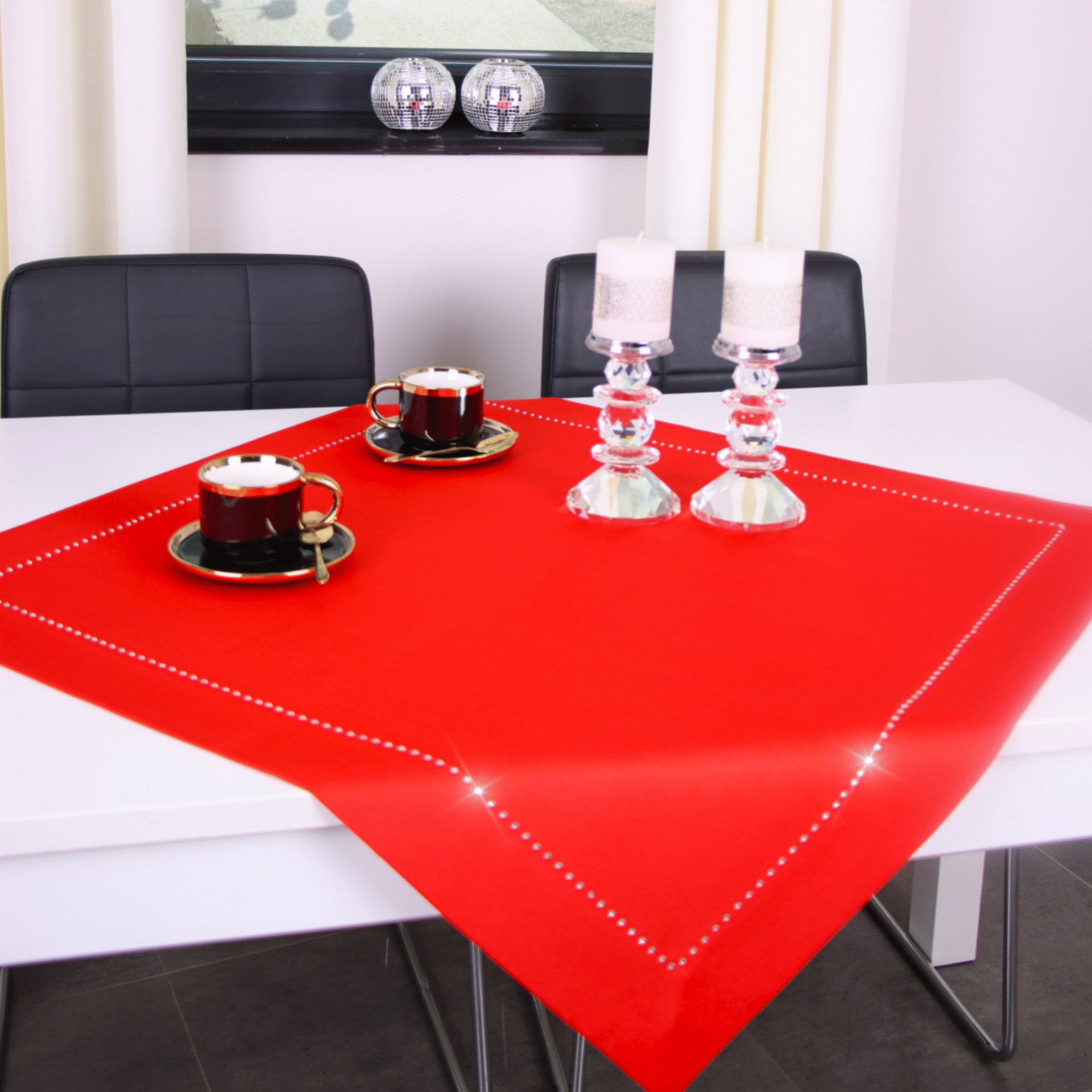 GLAMOUR to wyjątkowa kolekcja atłasowych obrusów wykończonych ozdobną listwą o szerokości 7 cm, wzdłuż obszycia ozdobione są nowoczesnym wzorem wykonanym z metalowych, srebrnych dżetów.