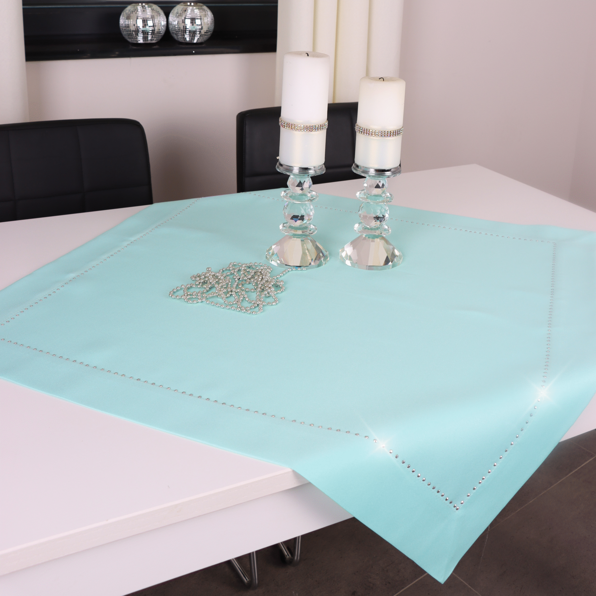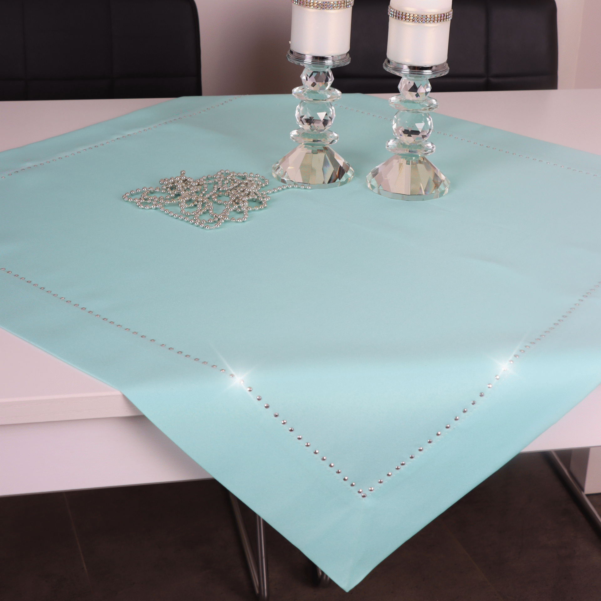 GLAMOUR to wyjątkowa kolekcja atłasowych obrusów wykończonych ozdobną listwą o szerokości 7 cm, wzdłuż obszycia ozdobione są nowoczesnym wzorem wykonanym z metalowych, srebrnych dżetów.