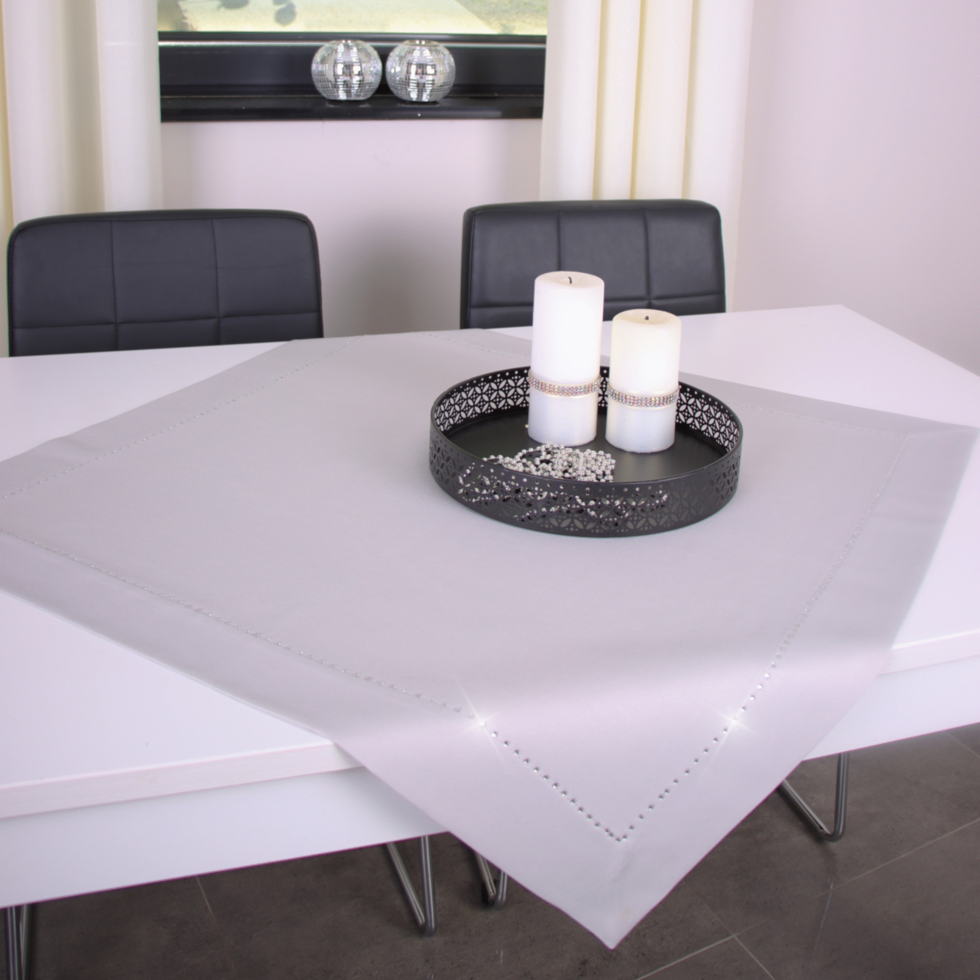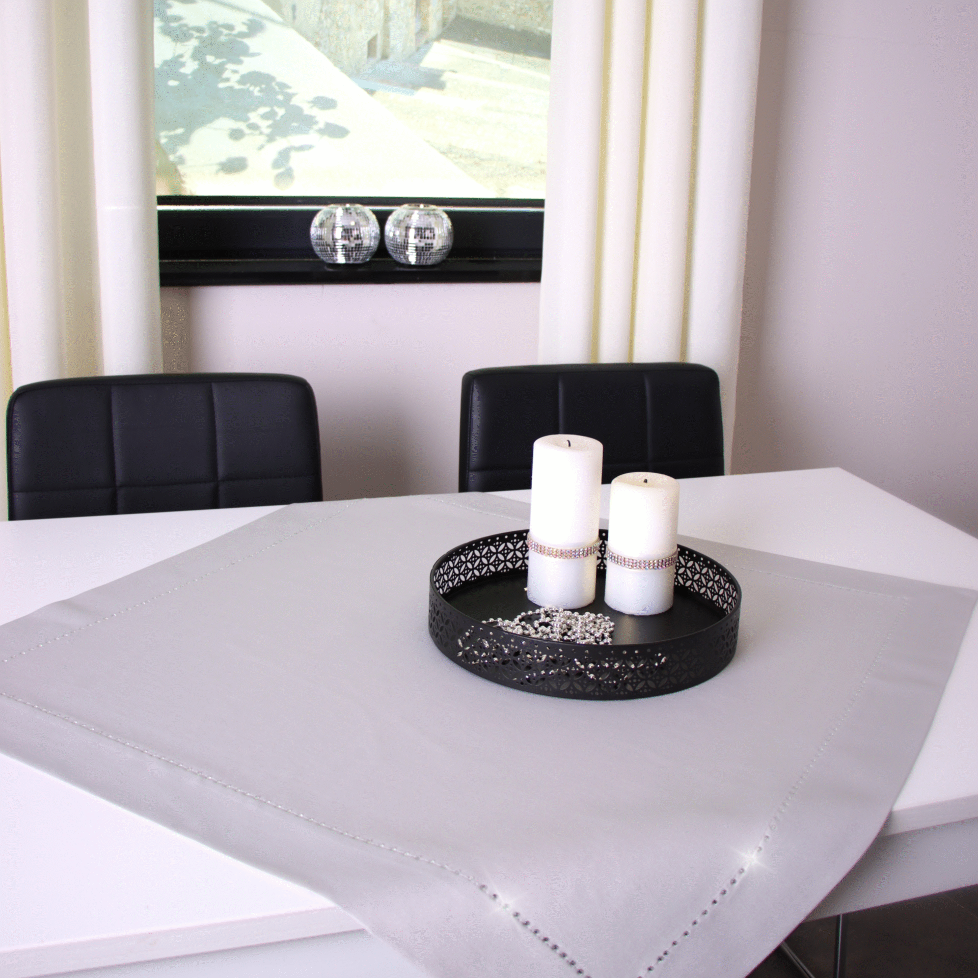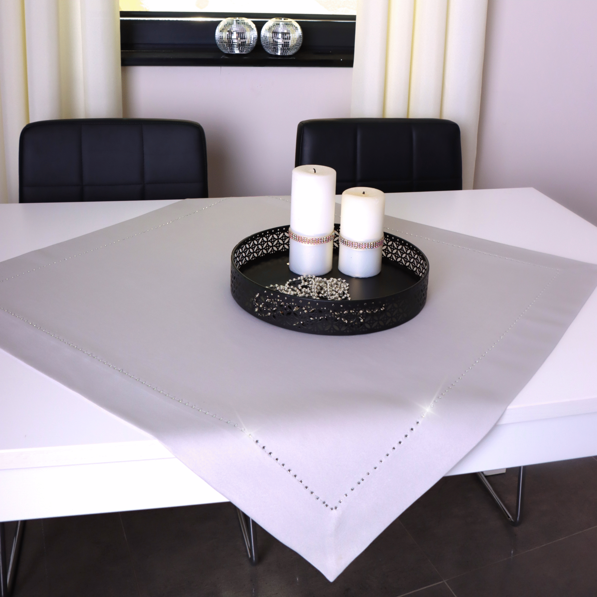 GLAMOUR to wyjątkowa kolekcja atłasowych obrusów wykończonych ozdobną listwą o szerokości 7 cm, wzdłuż obszycia ozdobione są nowoczesnym wzorem wykonanym z metalowych, srebrnych dżetów.
