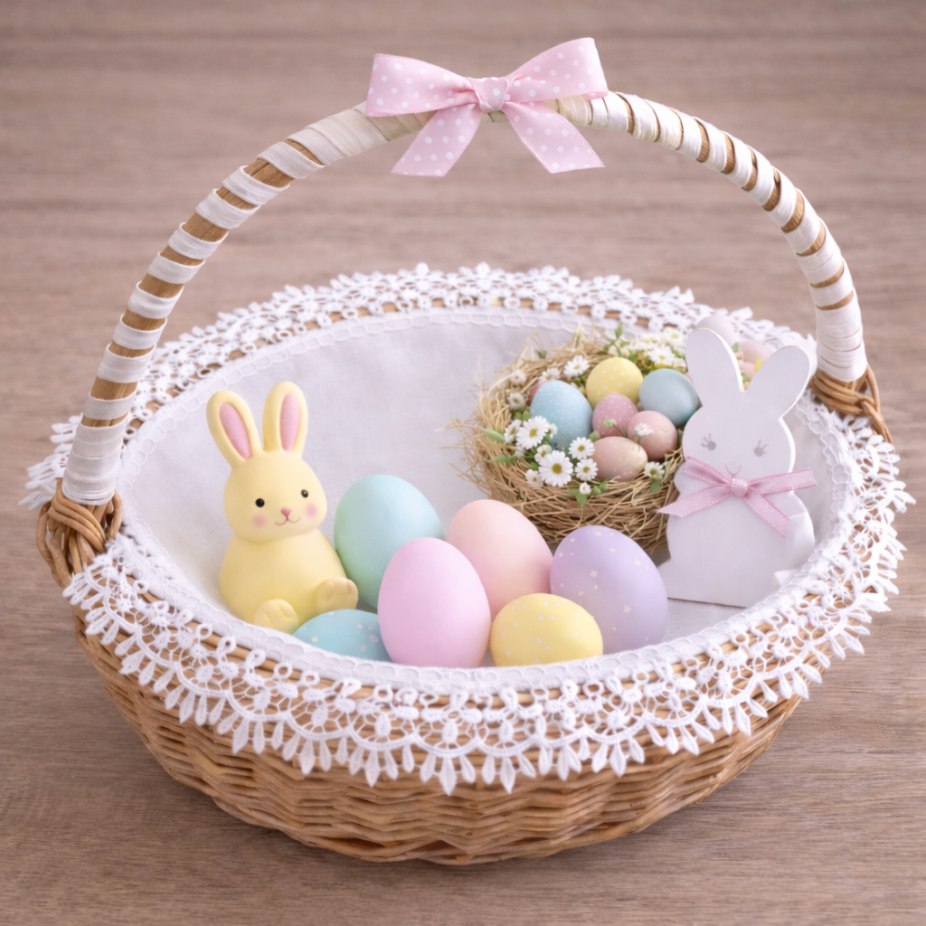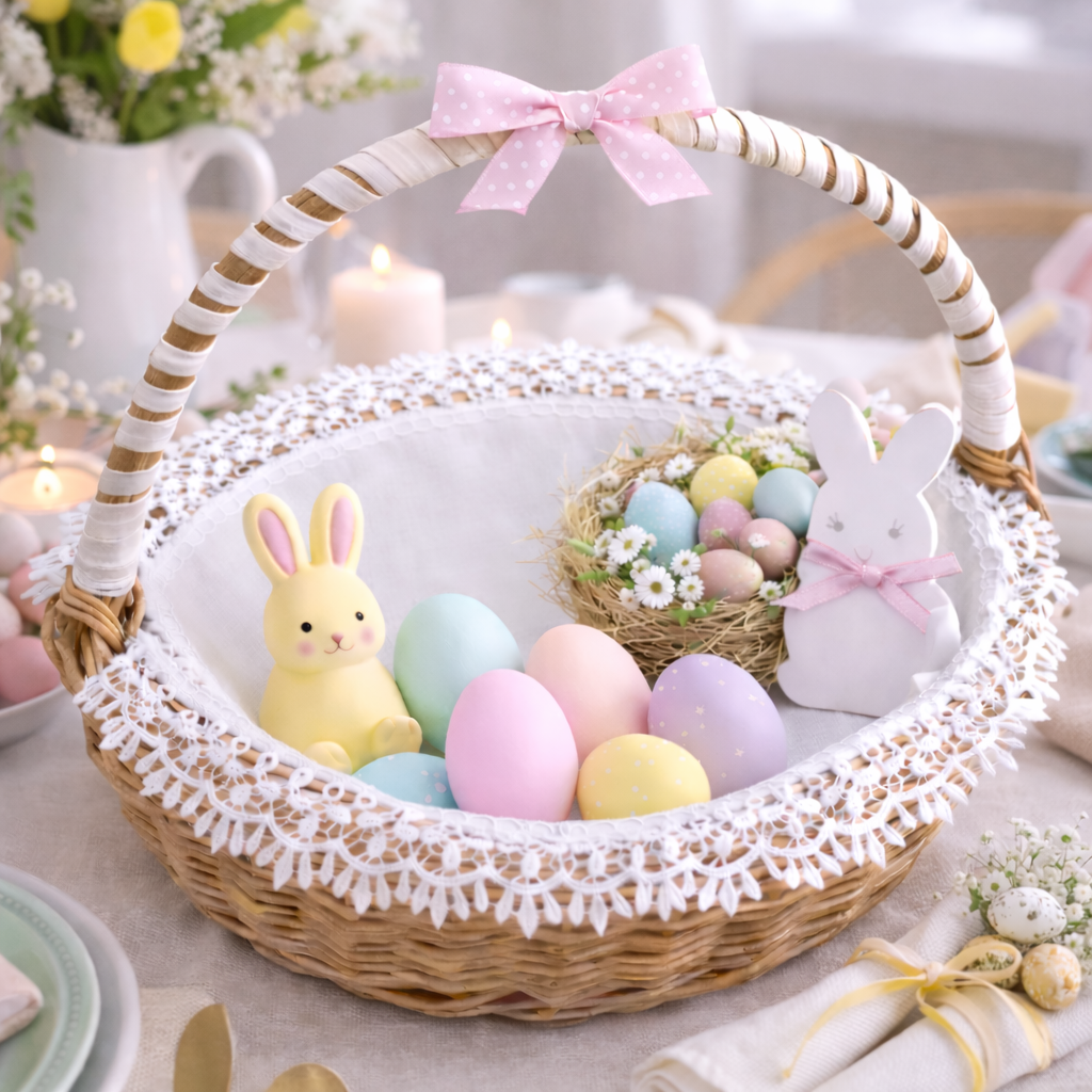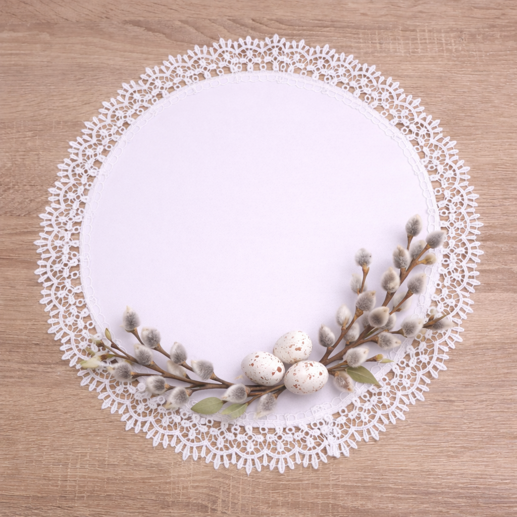 Serwetka do koszyczka wielkanocnego biała z gipiurą to elegancka dekoracja na Wielkanoc, idealna jako serwetka na święconkę. Delikatna, estetycznie wykończona i ponadczasowa, pięknie prezentuje się w koszyczku wielkanocnym. Biały kolor oraz ozdobna koronka sprawiają, że serwetka pasuje zarówno do tradycyjnych, jak i nowoczesnych aranżacji świątecznych. Produkt dostępny w rozmiarach 30×30 cm oraz 40×40 cm.